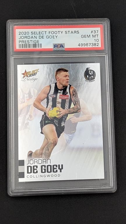 2020 SELECT FOOTY STARS #37 JORDAN DE GOEY PRESTIGE PSA GEM MT 10 Cert Number - 49967382 Item Grade - GEM MT 10 Label Type: PSA w/ Fugitive Ink Technology Reverse Cert/Barcode - Yes Year - 2020 Brand/Title - SELECT FOOTY STARS Subject - JORDAN DE GOEY Card Number - #37 Category - FOOTBALL Cards Variety/Pedigree - PRESTIGE