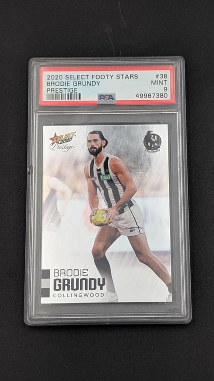 2020 SELECT FOOTY STARS #38 BRODIE GRUNDY PRESTIGE PSA MINT 9 Cert Number - 49967380 Item Grade - MINT 9 Label Type: PSA w/ Fugitive Ink Technology Reverse Cert/Barcode - Yes Year - 2020 Brand/Title - SELECT FOOTY STARS Subject - BRODIE GRUNDY Card Number - #38 Category - FOOTBALL Cards Variety/Pedigree - PRESTIGE
