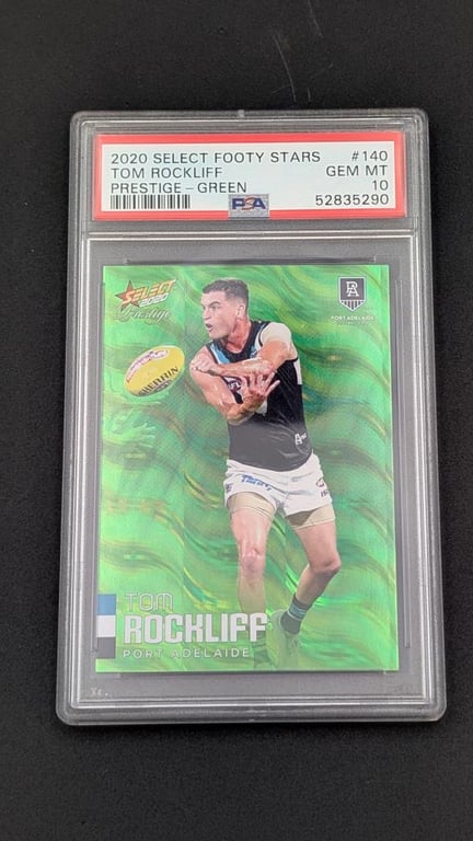 2020 SELECT FOOTY STARS #140 TOM ROCKLIFF PRESTIGE GREEN PSA GEM MT 10 Cert Number - 52835290 Item Grade - GEM MT 10 Label Type: PSA w/ Fugitive Ink Technology Reverse Cert/Barcode - Yes Year - 2020 Brand/Title - SELECT FOOTY STARS Subject - TOM ROCKLIFF Card Number - #140 Category - FOOTBALL Cards Variety/Pedigree - PRESTIGE GREEN