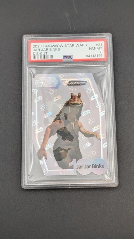 2023 KAKAWOW STAR WARS #31 JAR JAR BINKS DIE-CUT PSA NM-MT 8 Cert Number - 84113145 Item Grade - NM-MT 8 Label Type: PSA w/ Fugitive Ink Technology Reverse Cert/Barcode - Yes Year - 2023 Brand/Title - KAKAWOW STAR WARS Subject - JAR JAR BINKS Card Number - #31 Category - COLLECTOR Cards Variety/Pedigree - DIE-CUT