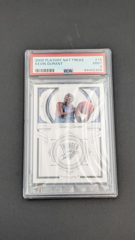 2009 PLAYOFF NAT. TREAS. #15 KEVIN DURANT PSA MINT 9 Cert Number - 64402268 Item Grade - MINT 9 Label Type: PSA w/ Fugitive Ink Technology Reverse Cert/Barcode - Yes Year - 2009 Brand/Title - PLAYOFF NAT. TREAS. Subject - KEVIN DURANT Card Number - #15 Category - BASKETBALL Cards