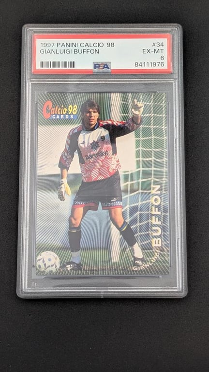 1997 PANINI CALICIO '98 #34 GIANLUIGI BUFFON PSA EX-NM 7 Cert Number - 84111976 Item Grade - EX-NM 7 Label Type: PSA w/ Fugitive Ink Technology Reverse Cert/Barcode - Yes Year - 1997 Brand/Title - PANINI CALICIO '98 Subject - GIANLUIGI BUFFON Card Number - #34 Category - FOOTBALL Cards