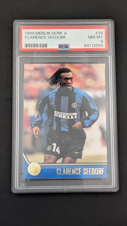1999 MERLIN SERIE A #26 CLARENCE SEEDORF PSA NM-MT 8 Cert Number - 84112009 Item Grade - NM-MT 8 Label Type: PSA w/ Fugitive Ink Technology Reverse Cert/Barcode - Yes Year - 1999 Brand/Title - MERLIN SERIE A Subject - CLARENCE SEEDORF Card Number - #26 Category - FOOTBALL Cards