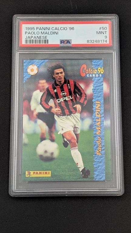 1995 PANINI CALICIO '96 #50 PAOLO MALDINI JAPANESE PSA MINT 9 Cert Number - 83248174 Item Grade - MINT 9 Label Type: PSA w/ Fugitive Ink Technology Reverse Cert/Barcode - Yes Year - 1995 Brand/Title - PANINI CALICIO '96 Subject - PAOLO MALDINI Card Number - #50 Category - FOOTBALL Cards Variety/Pedigree - JAPANESE