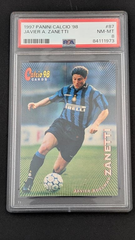 1997 PANINI CALICIO '98 #87 JAVIER A. ZANETTI PSA NM-MT 8 Cert Number - 84111973 Item Grade - NM-MT 8 Label Type: PSA w/ Fugitive Ink Technology Reverse Cert/Barcode - Yes Year - 1997 Brand/Title - PANINI CALICIO '98 Subject - JAVIER A. ZANETTI Card Number - #87 Category - FOOTBALL Cards