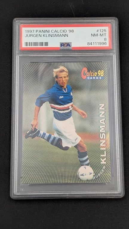 1997 PANINI CALICIO '98 #125 JURGEN KLINSMANN PSA NM-MT 8 Cert Number - 84111996 Item Grade - NM-MT 8 Label Type: PSA w/ Fugitive Ink Technology Reverse Cert/Barcode - Yes Year - 1997 Brand/Title - PANINI CALICIO '98 Subject - JURGEN KLINSMANN Card Number - #125 Category - FOOTBALL Cards