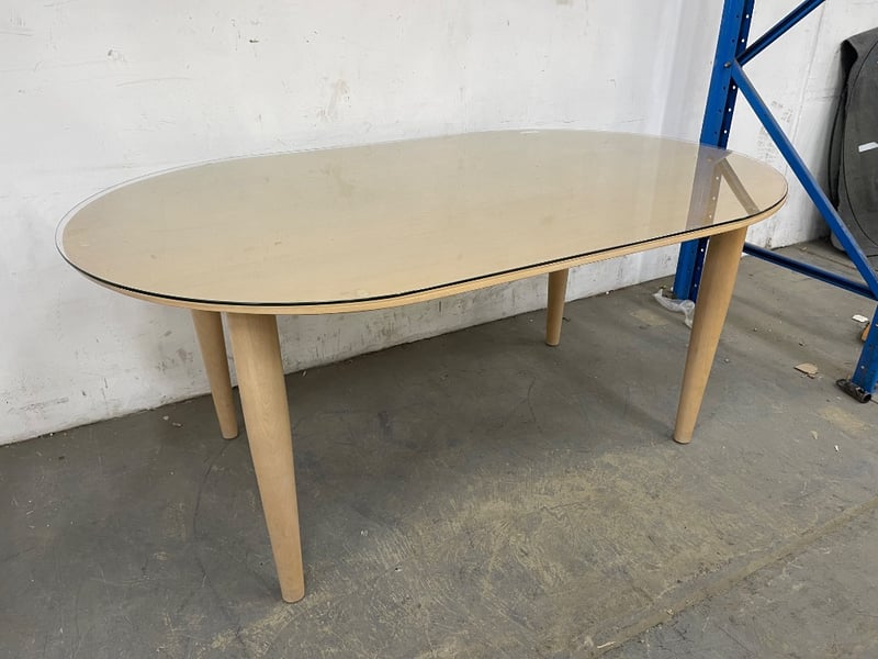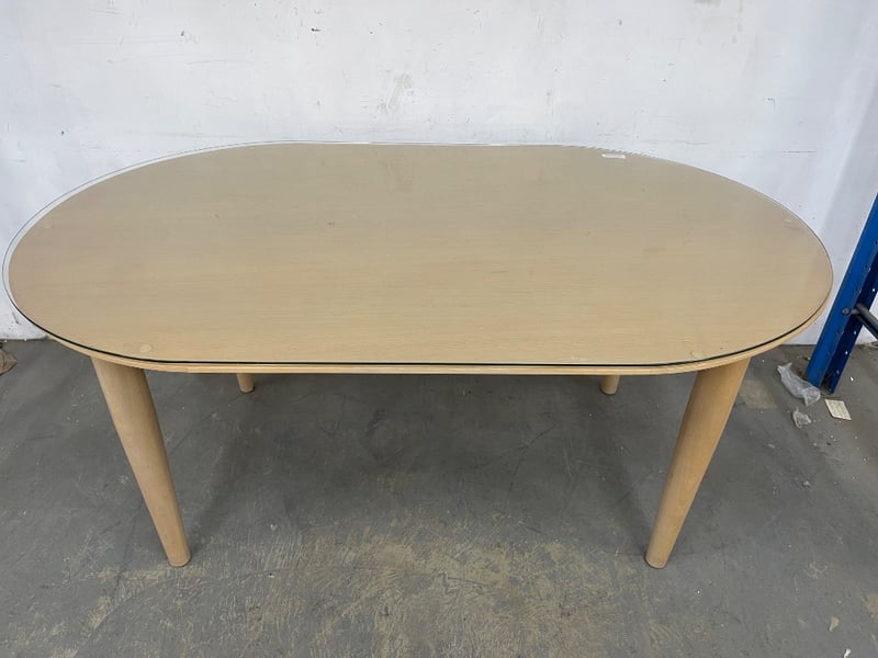 Oval table, timber finish, light brown finish, glass top.