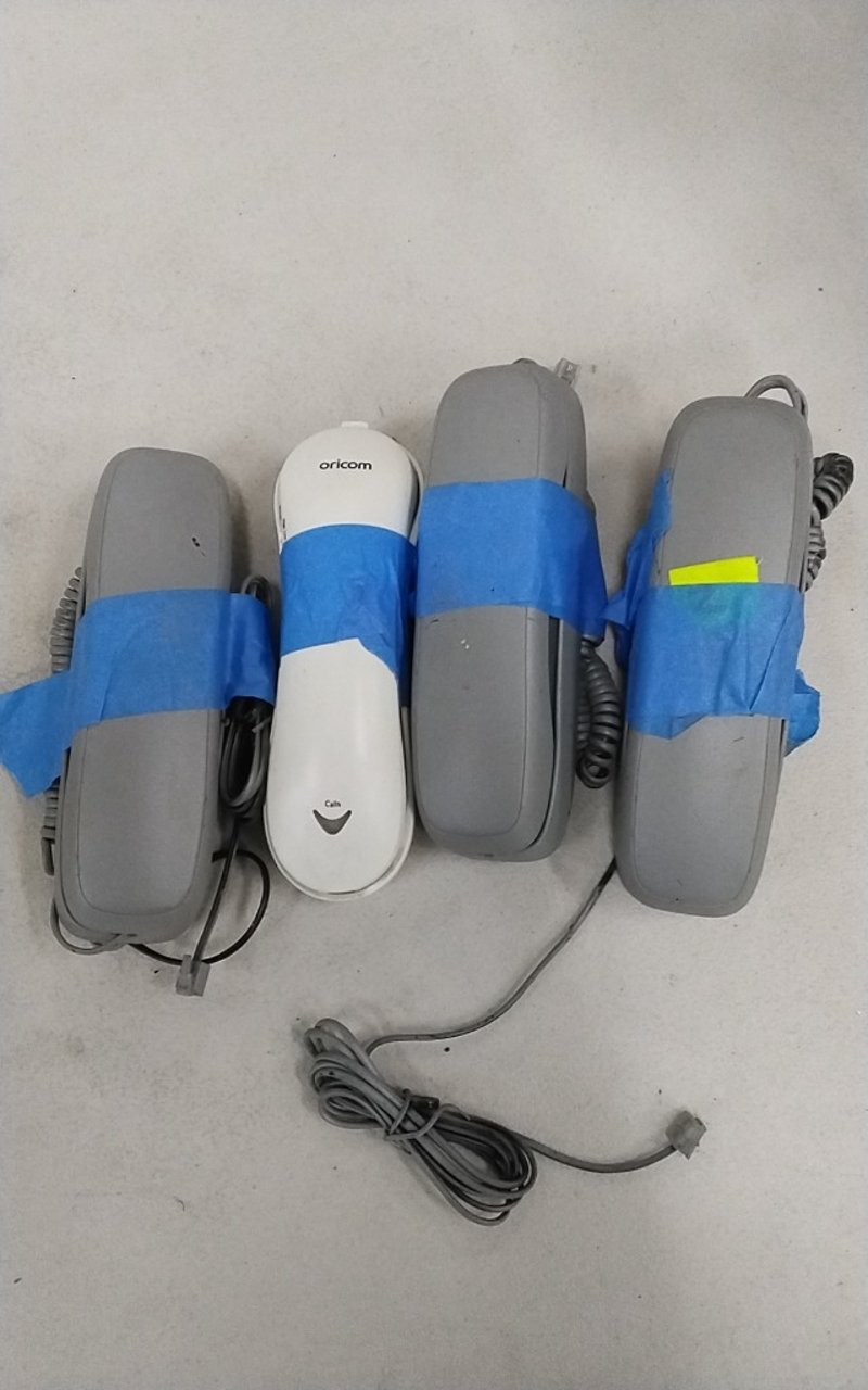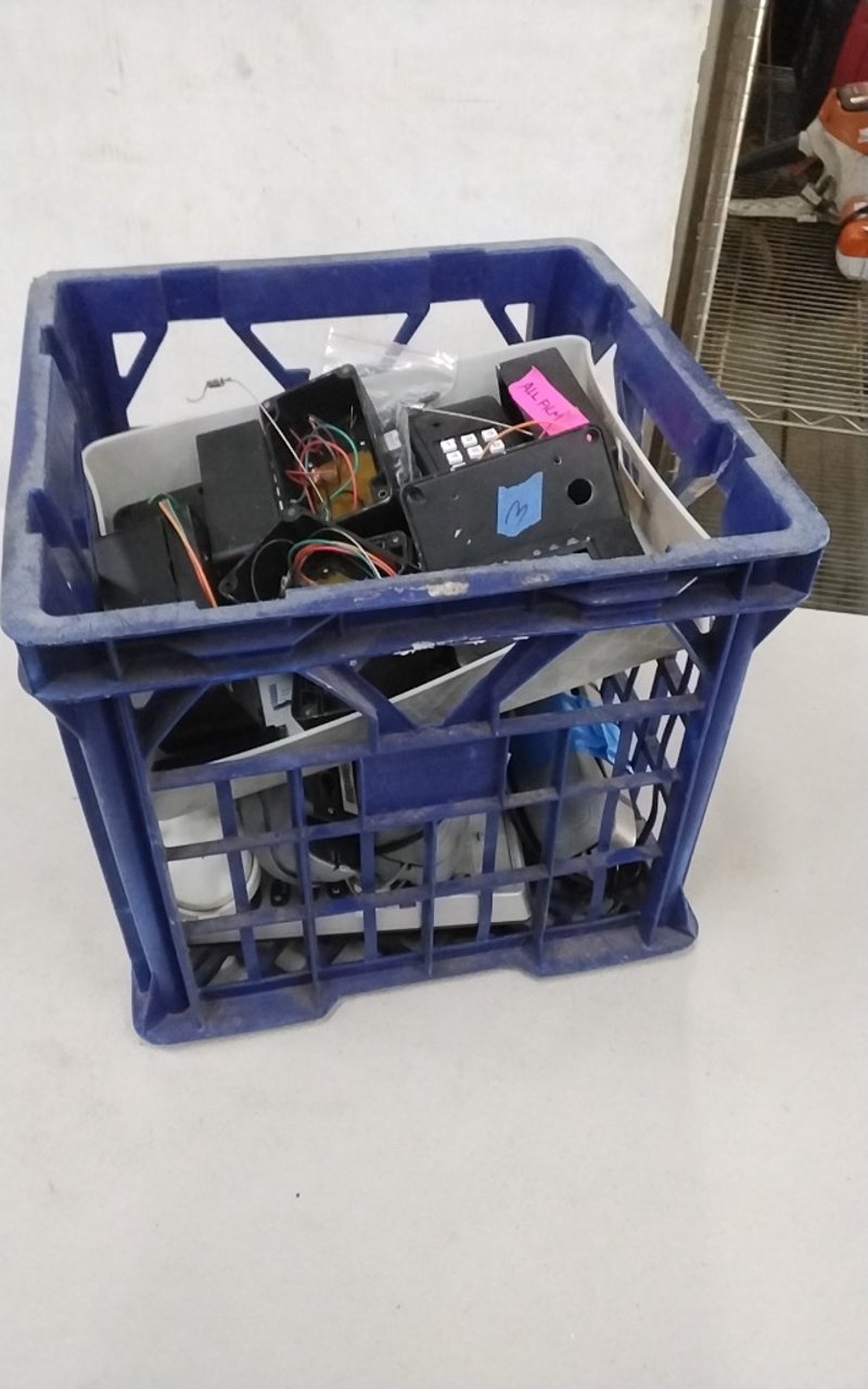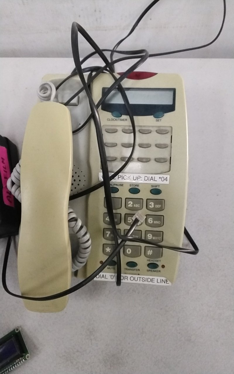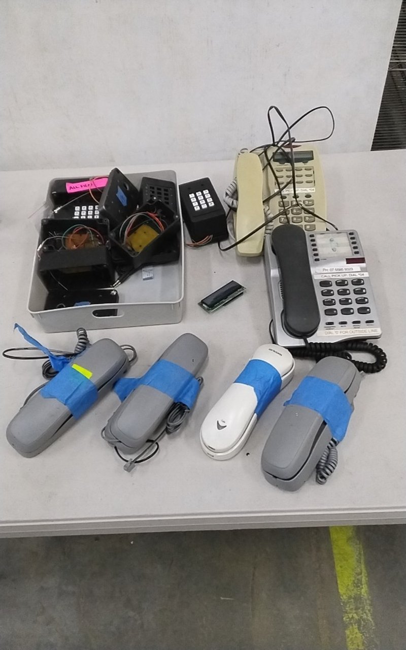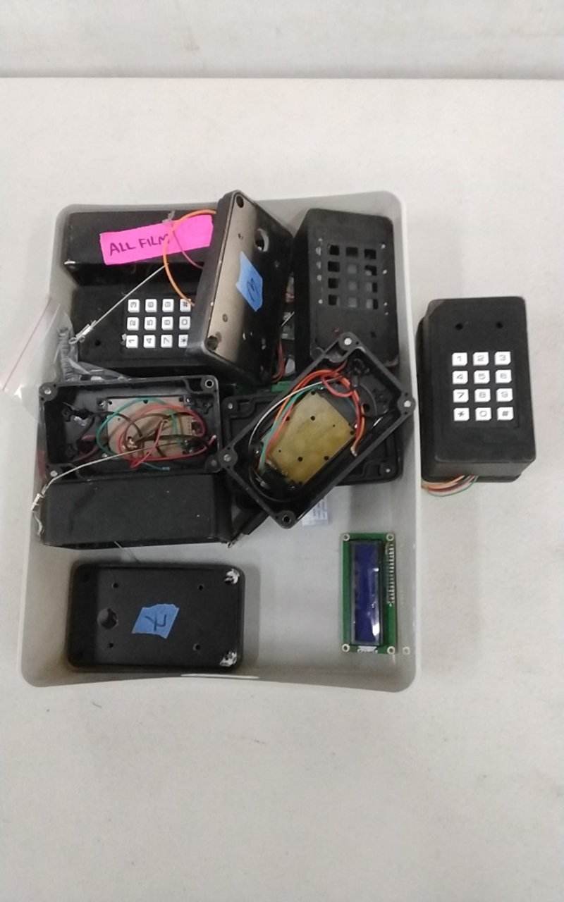 Movie PropsPlastic crate containing assorted telephones, and digital lock key boardsSOLD AS LOT