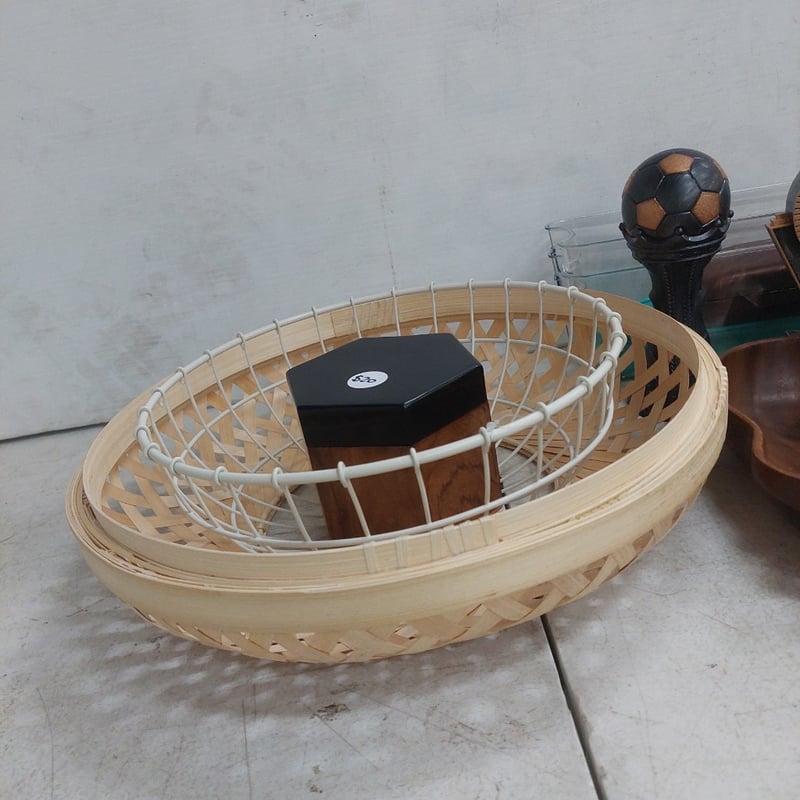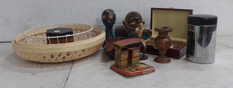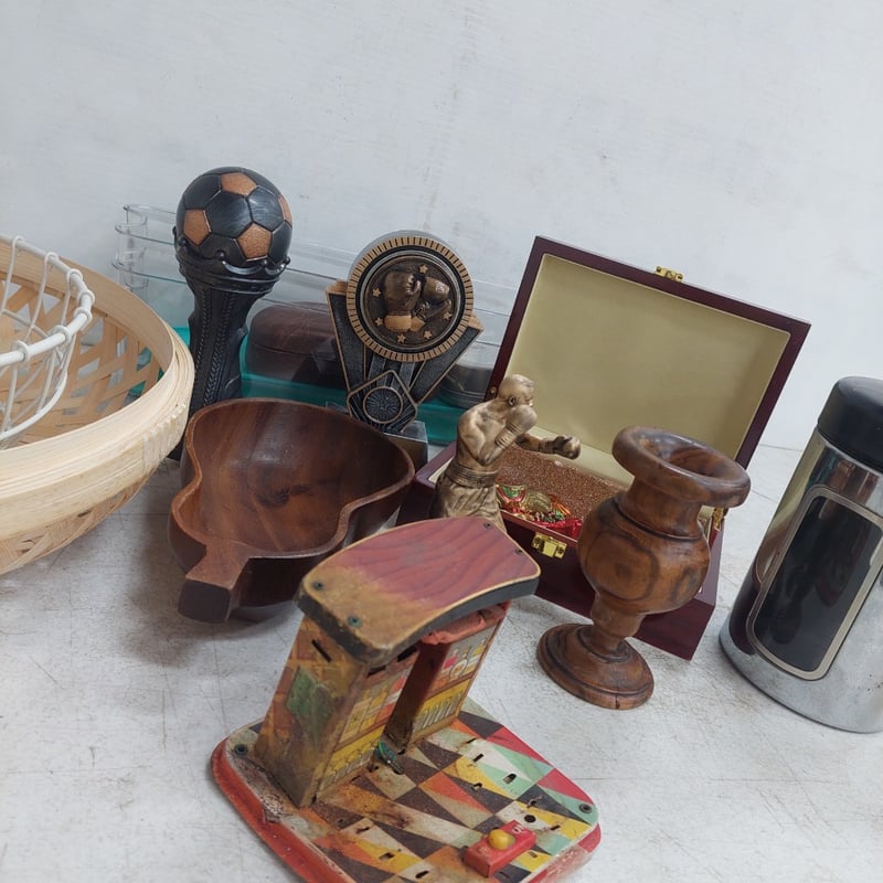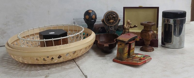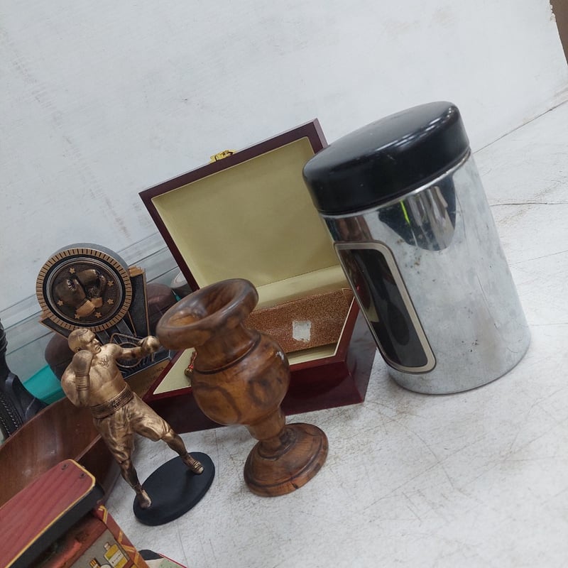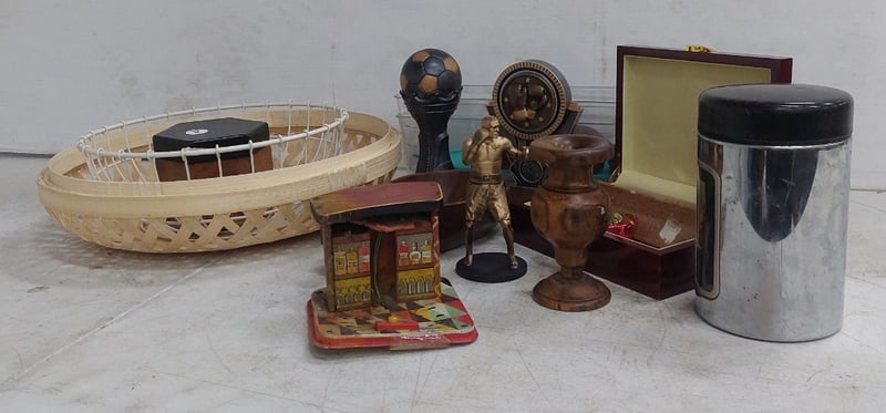 Assorted Lot of Storage Containers, Baskets, Ornamental Trophies Sold as lot.