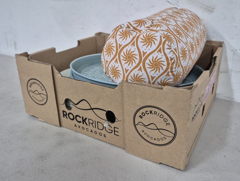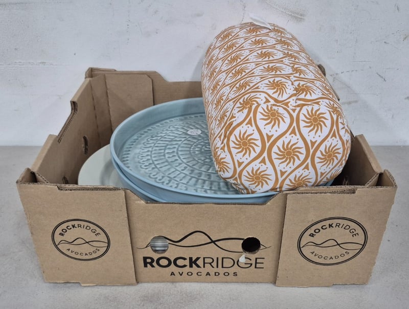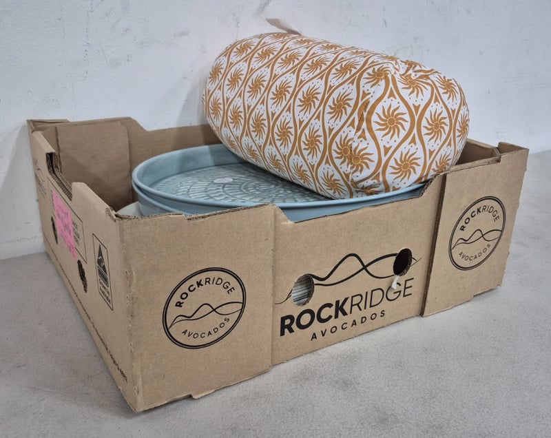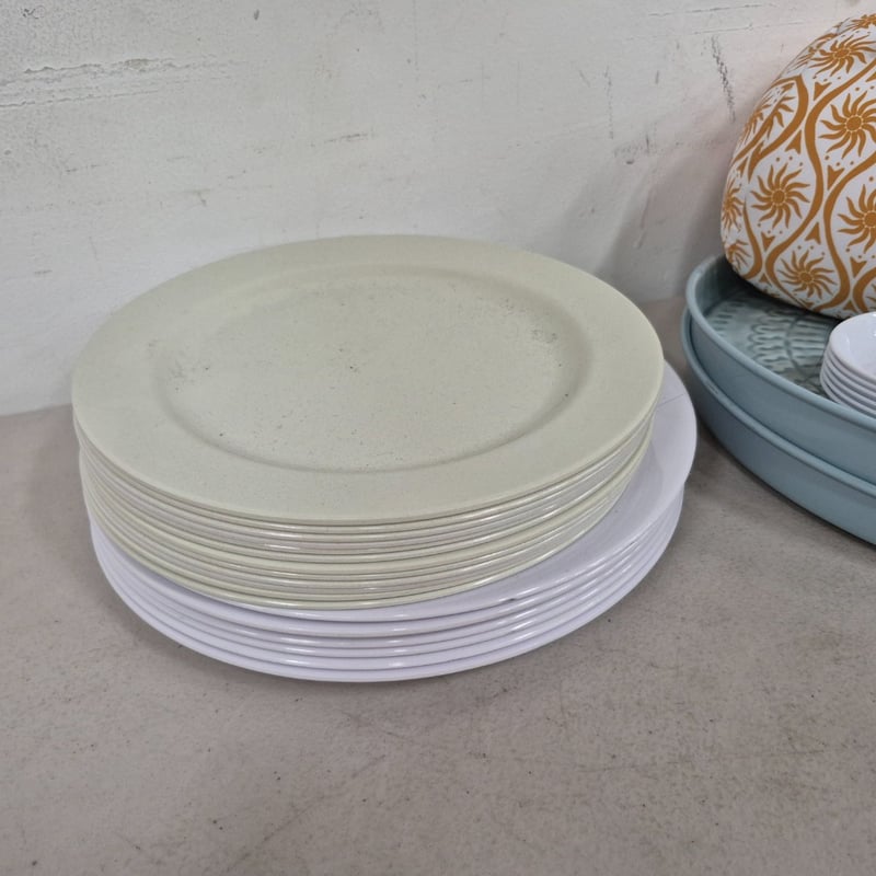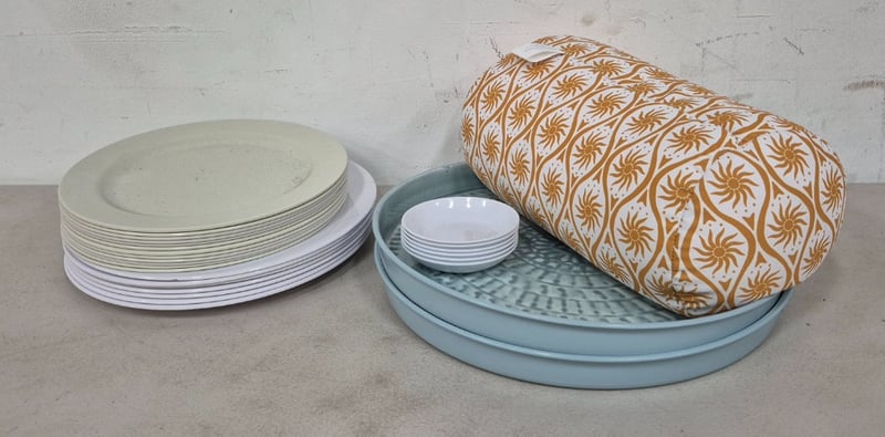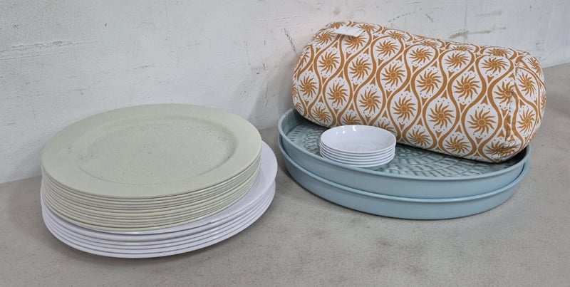 Assorted of Lot of Plates and Trays, Various Sizes, Material: Ceramic and Plastic, Nylon Pillow with Polysterene Beads, and more. Sold as lot.