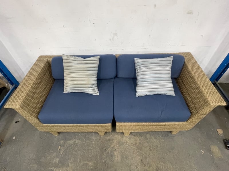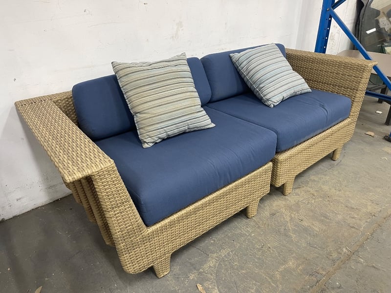 Modular outdoor wicker loveseat or sofa with cushions, The frame is made of synthetic rattan or wicker. Cushions are dark blue, Can be separate but identical pieces pushed together, allowing for flexible arrangement
