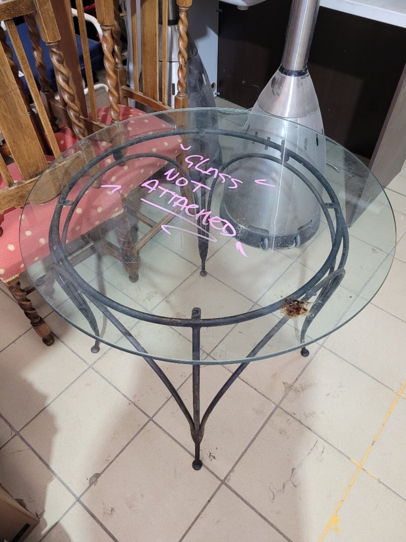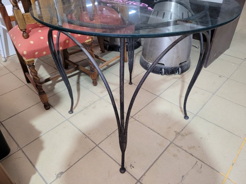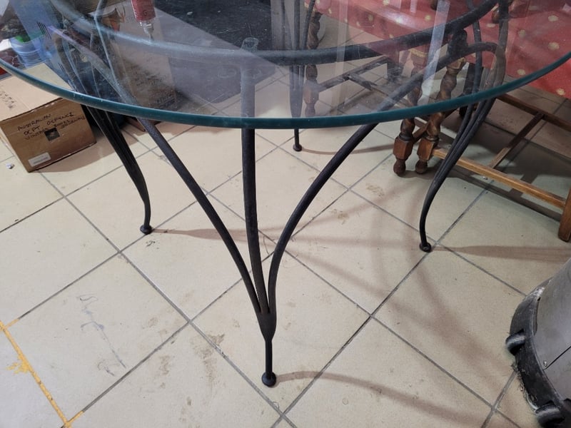 Detachable Round Glass Table with a Wrought Iron Base Dimensions H:75cm W:90cm D:90cm