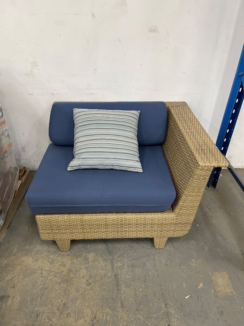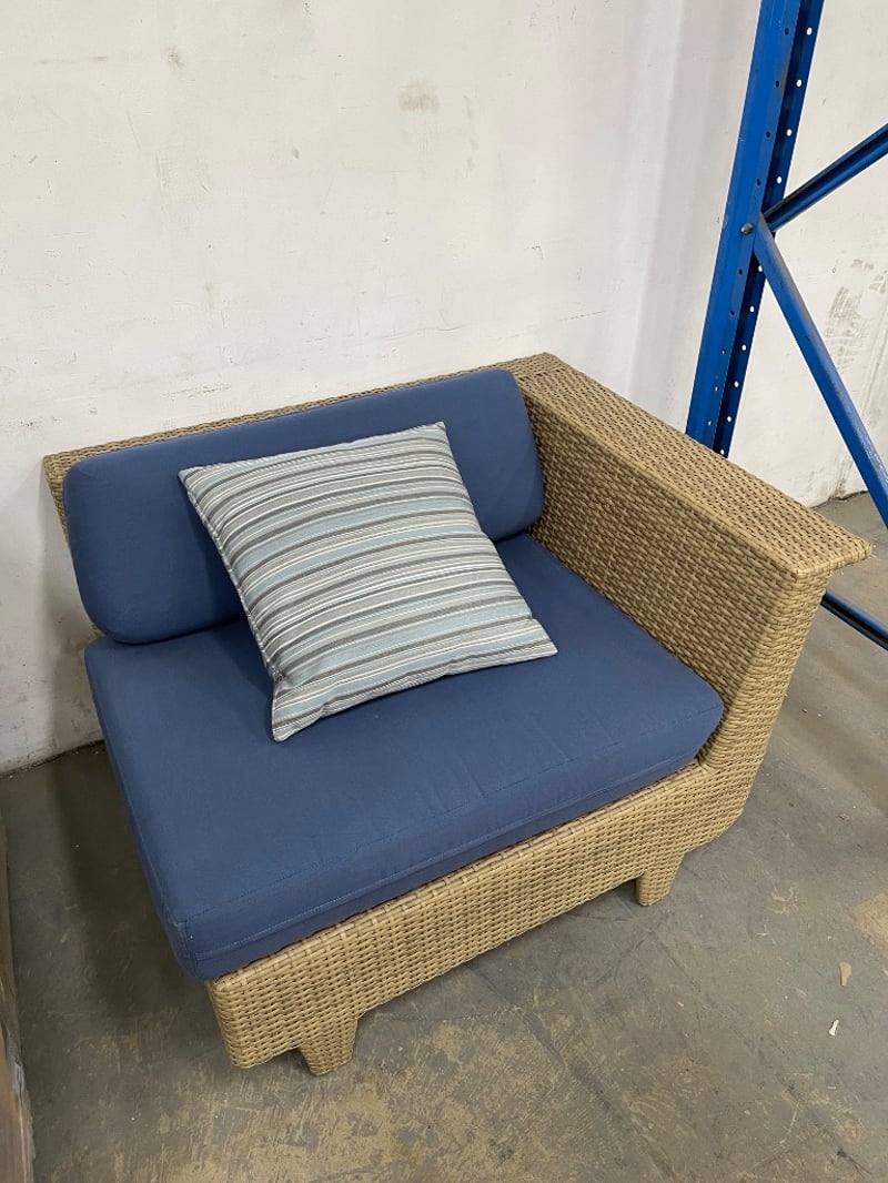 Modular outdoor wicker loveseat or sofa with cushions, The frame is made of synthetic rattan or wicker. Cushions are dark blue,