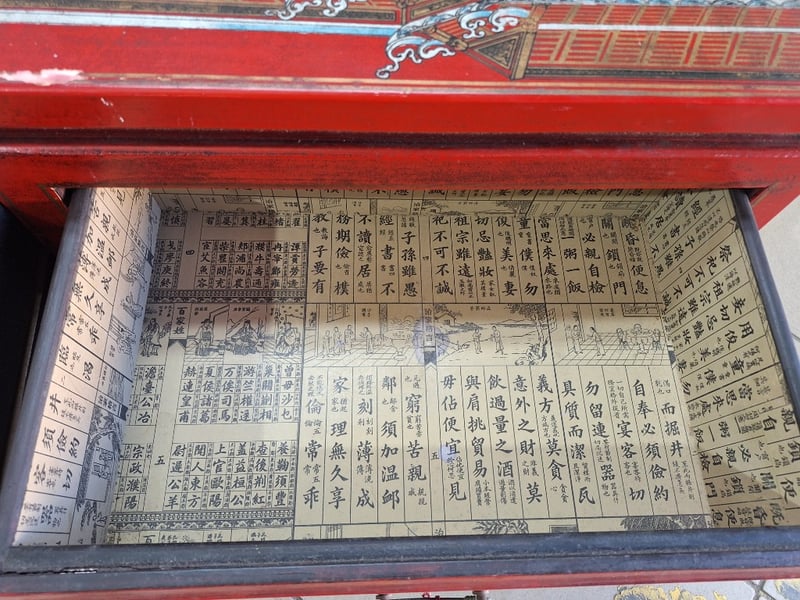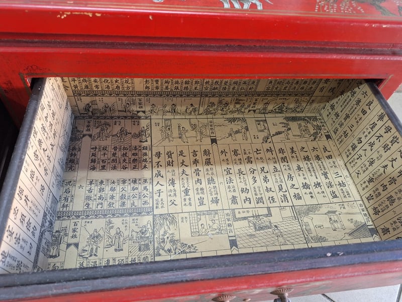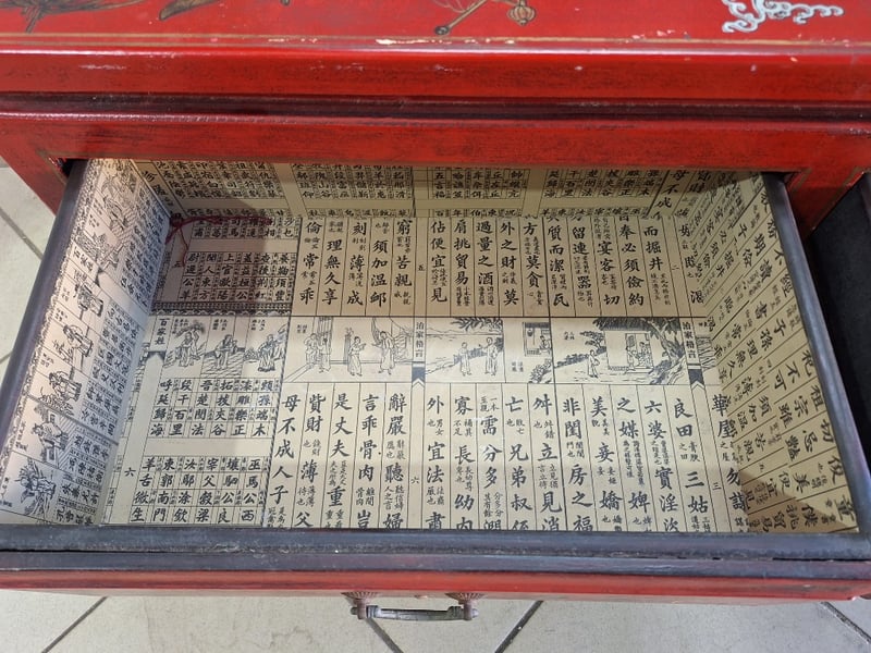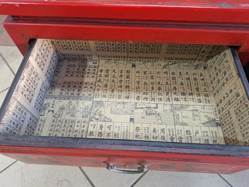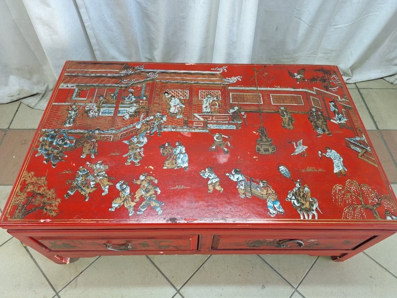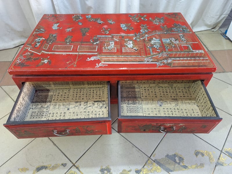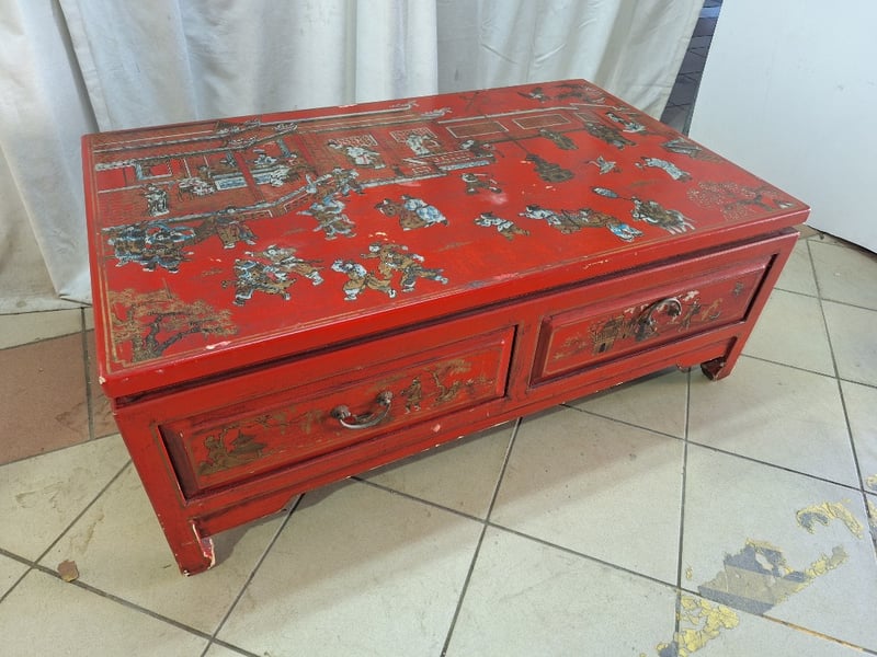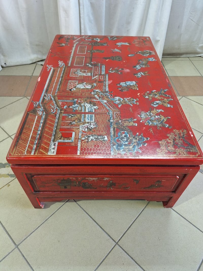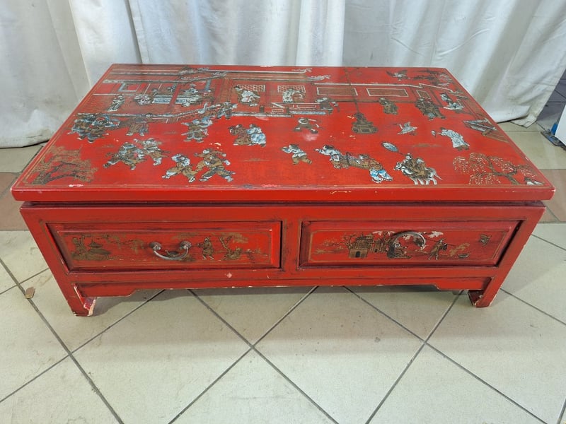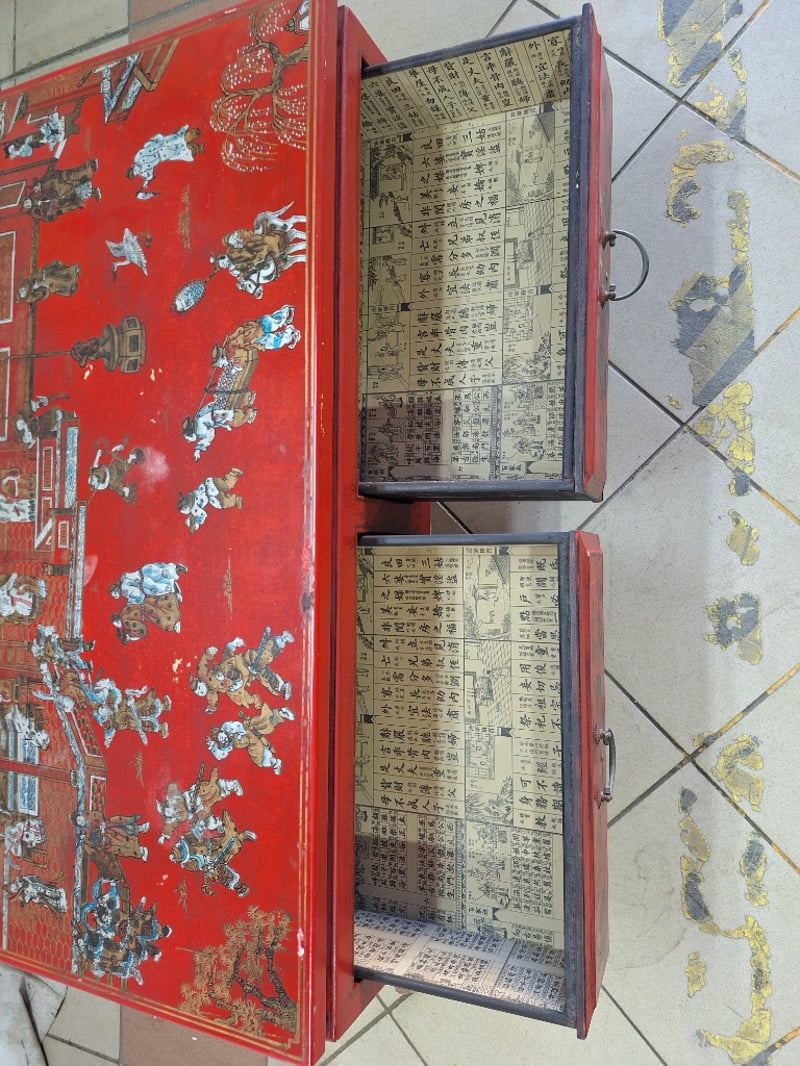 Chinese Coffee Table, Double Sided Drawers, Timber Style, Red Finish Dimensions H:41cm W:107cm D:66cm