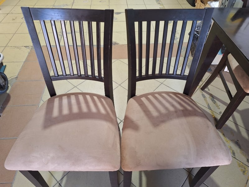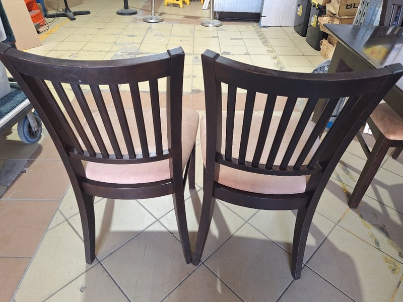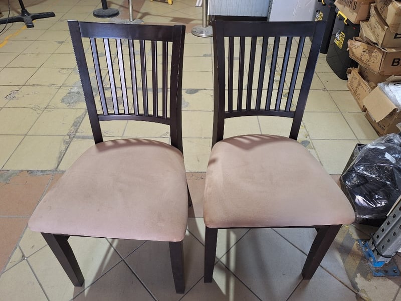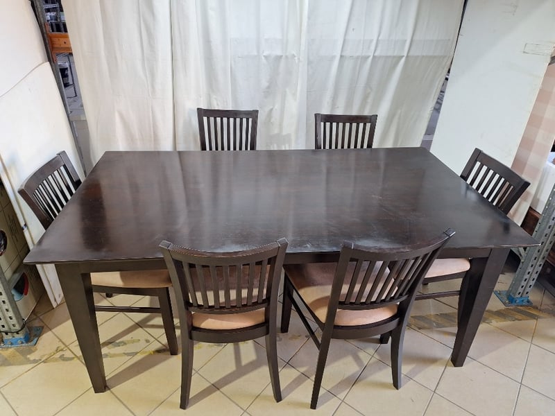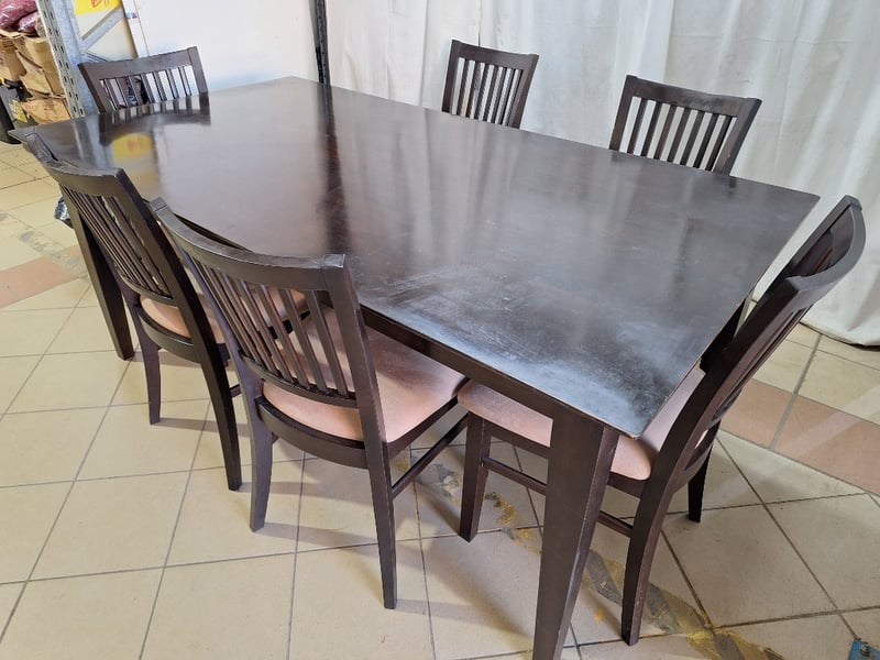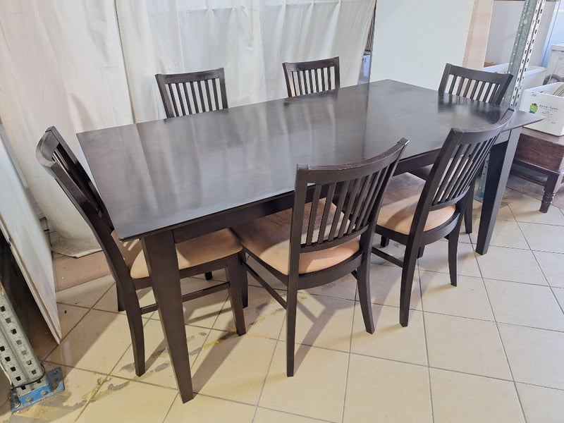 6-Seater Dining Table, Cushions On Chairs, Timber, Dark Brown Finish Dimensions Chair H:88cm W:50cm D:44cm Dimensions Table H:77cm W:183cm D:99cm SOLD AS LOT