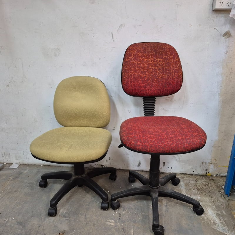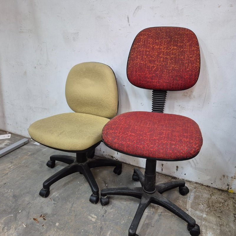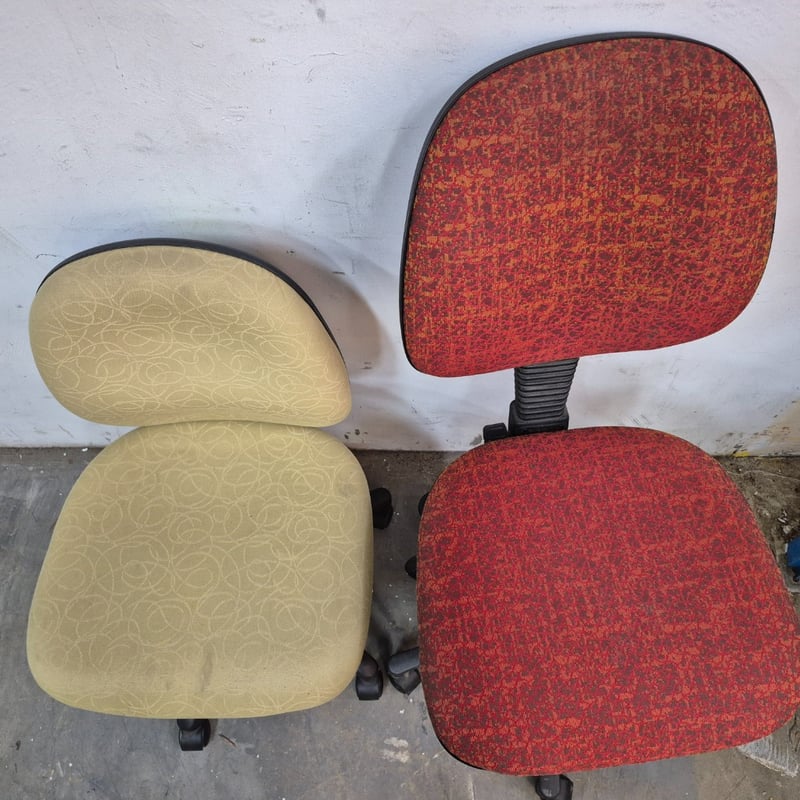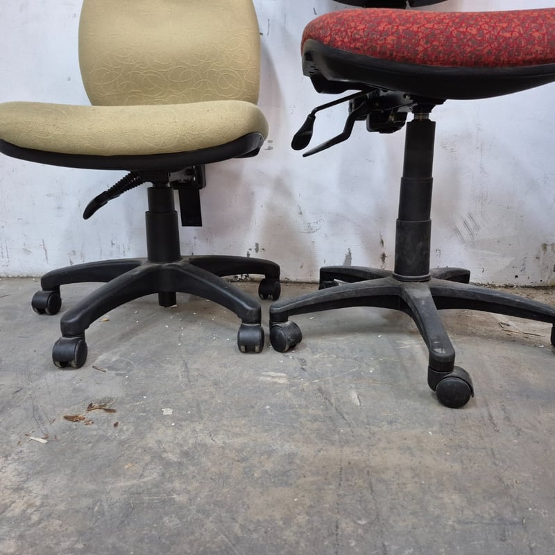 Assorted lot. 2 x assorted colour swivel chair, adjustable height lever, wheels, cushion seats and back support Rough Dimensions: H 125cm x 75cm x D 75cm SOLD AS LOT