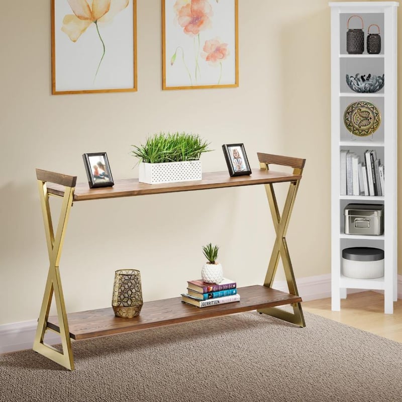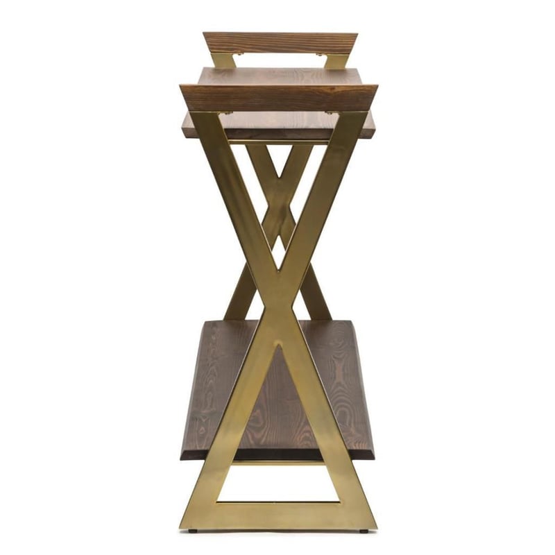 RRP $695 Wooden Iron Console Table with 2 Shelves Brand New - Orignal Packaging - Add great elegance and style your Home with the timeless design of this stunning Wooden Iron Console Table with 2 Shelves. It effortlessly blends Rustic and Contemporary with the combination of Iron Legs and a smooth Wood Top - Product Dimensions (Length) 131cm (Width) 38cm (Height) 85cm - Product Weight 14kg - Colour Body: French Brass | Shelf Base: Walnut Finish - Material Details Body: Iron | Shelf Base: Pine Wood