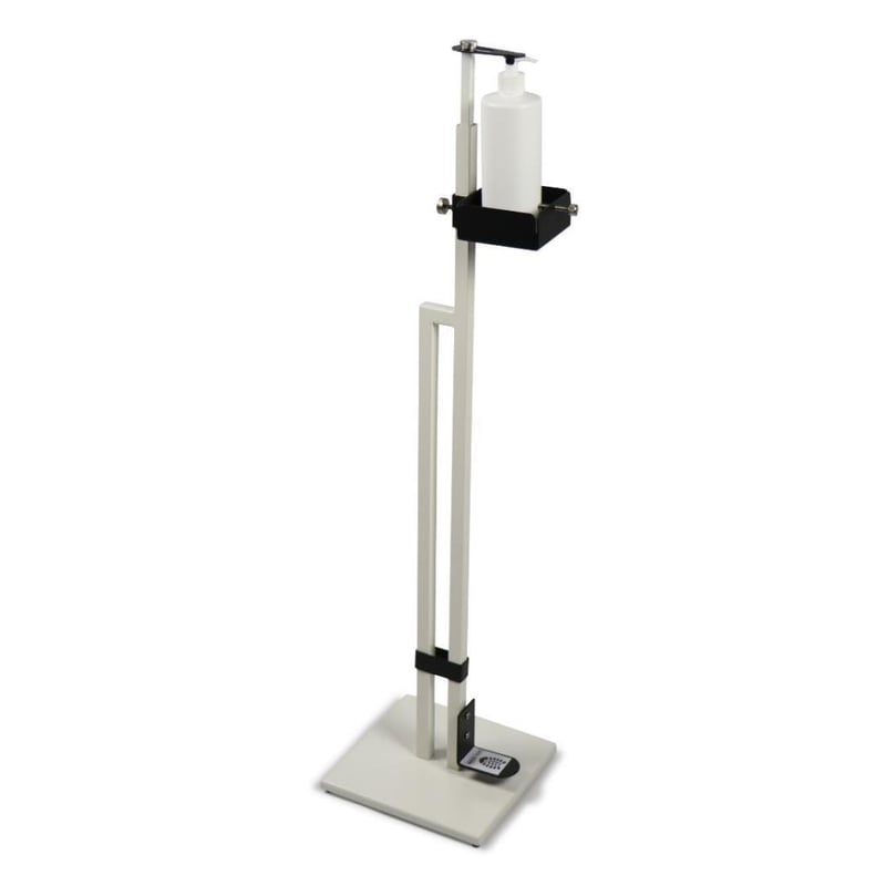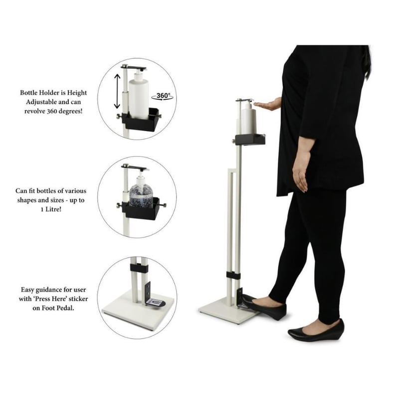 RRP $360 Touchless Hand Soap/Sanitiser Floor Stand with Foot Pedal - White Black Brand New - Orignal Packaging - This Soap/Sanitiser Dispenser Stand is Height Adjustable and can accommodate bottles of various shapes and sizes from 12cm to 32cm tall. The direction of the Bottle Holder can be revolved 360 degrees and placed in any direction. This Free Standing Soap/ Sanitiser Stand has been ergonomically designed and can be placed in any commercial/residential setting - Product Dimensions (Length) 25cm (Width) 24cm (Height) 105cm - Product Weight 4kg - Colour White & Black - Material(s) Iron