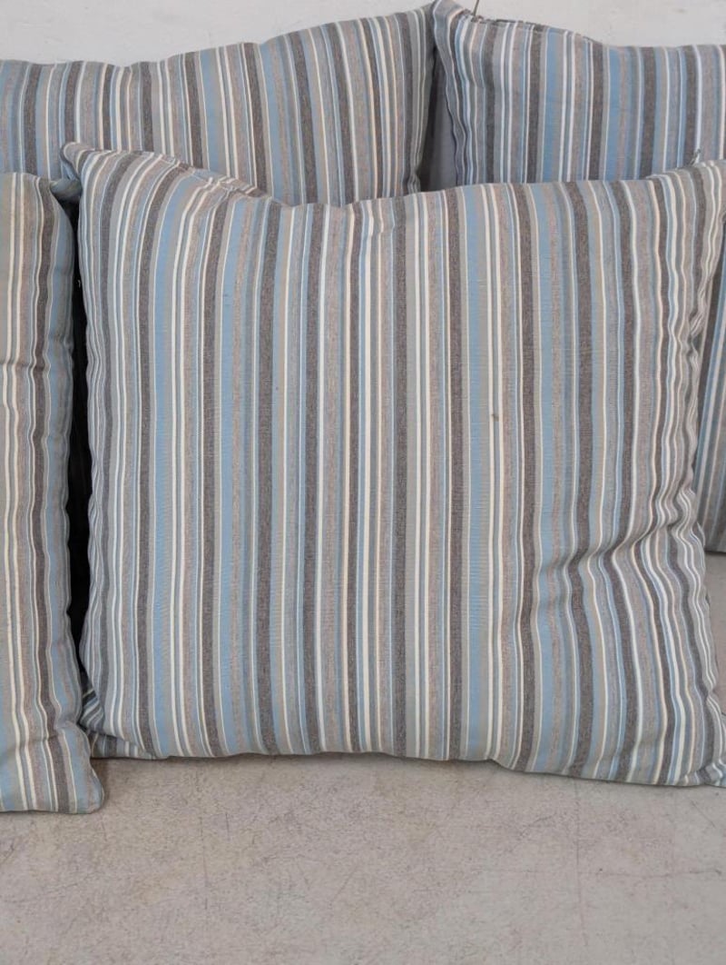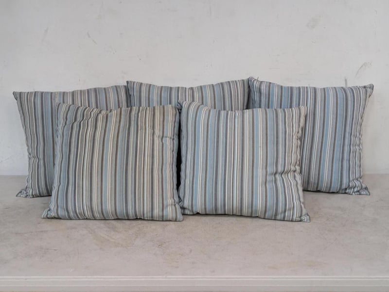 5 x Cushions, Blue Finish Striped PatternNote: some marks and stains visibleSOLD AS LOT