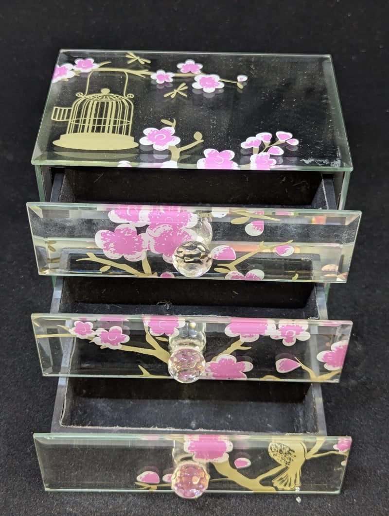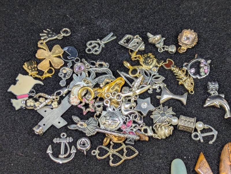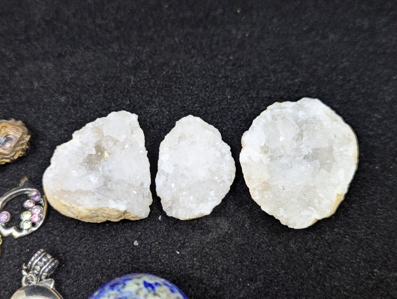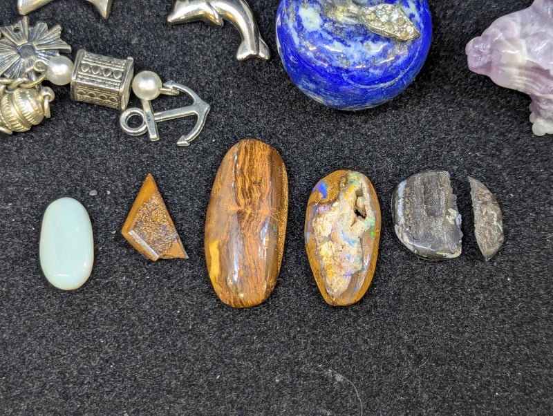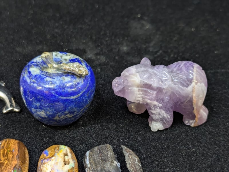 JEWELLERY BOX WITH COLLECTION OF CHARMS, CRYSTAL GEODE, PRECIOUS STONE FIGURES INCLUDING APPLE AND BEAR, 71TCW ROUGH OPALS584892+154