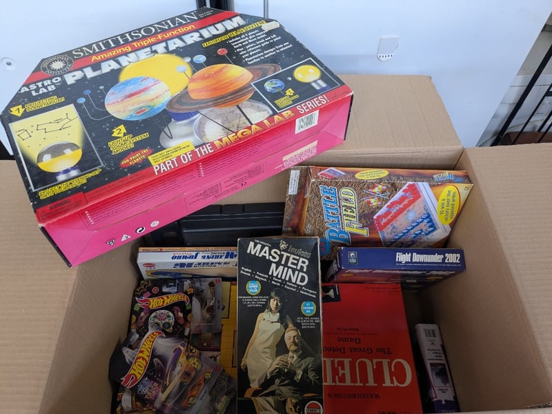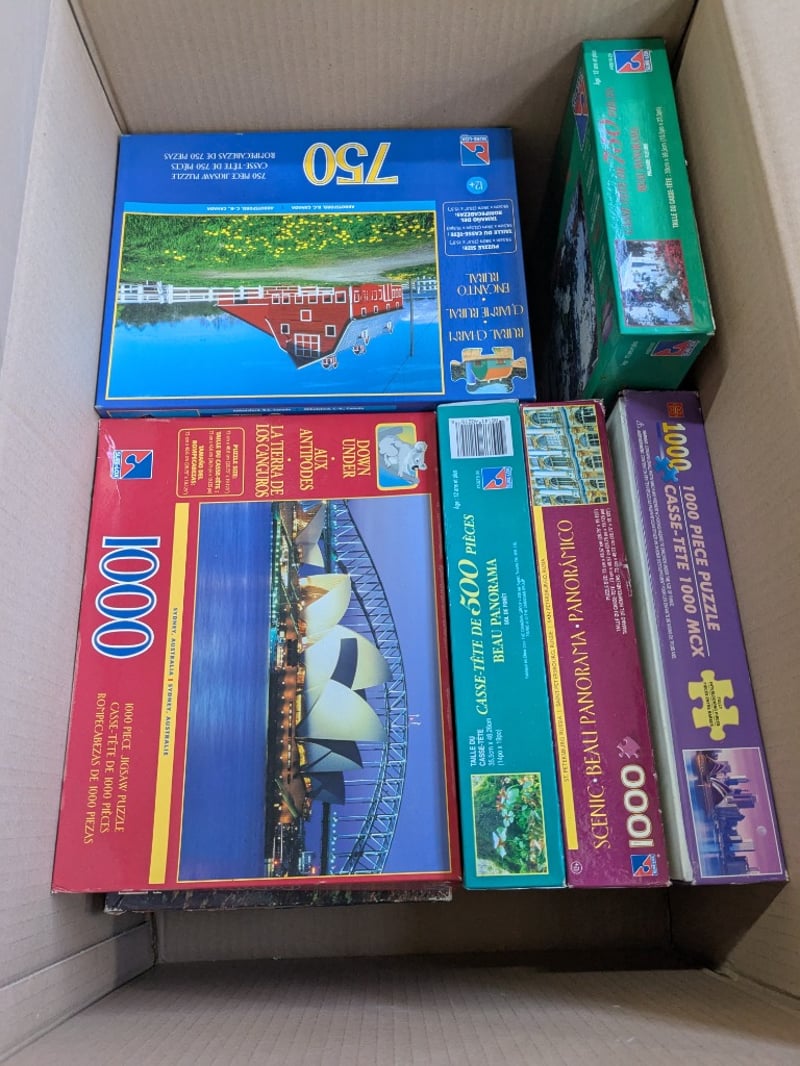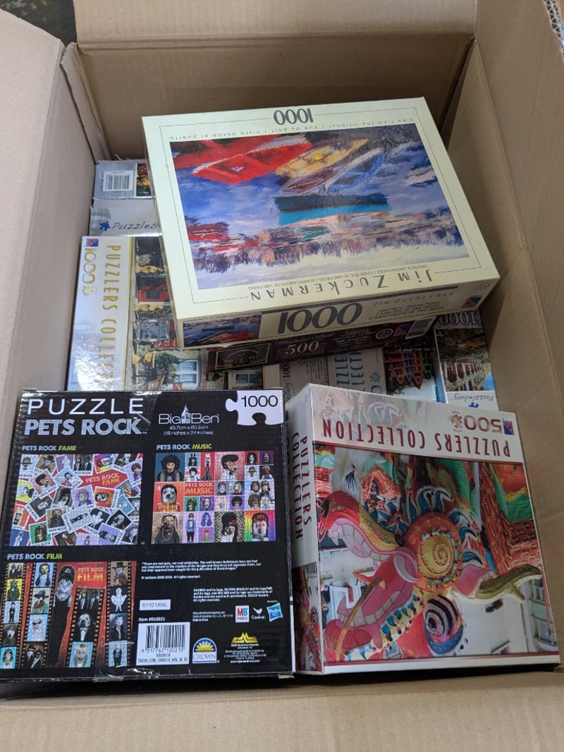 Toys/ games, 7 boxes including hot wheels, assorted puzzles and more
