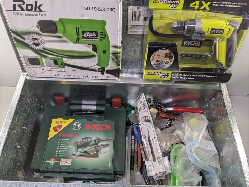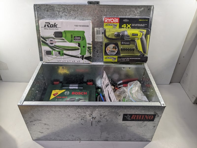 Tools, includes Rhino tool box with assorted hand and power tools Sold as lot