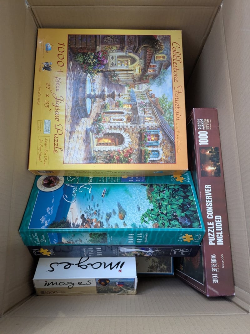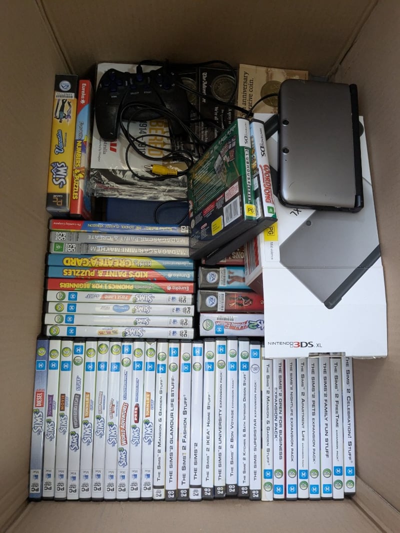 Entertainment, 3 boxes including assorted Sims PC CD games, Nintendo 3DS XL console only, records, puzzles and more
