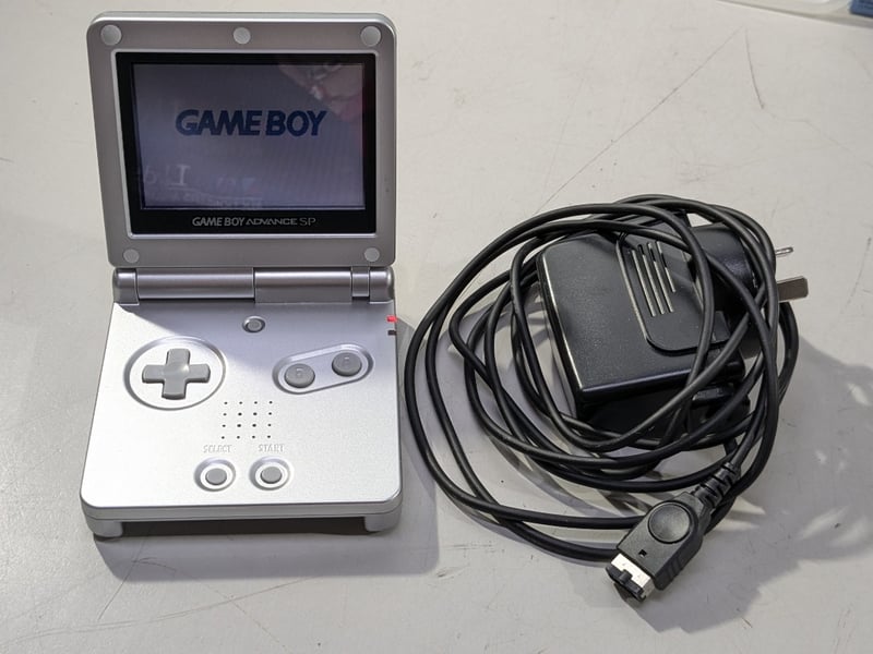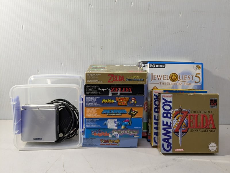 Console, Game Boy Advance SP console with 7 x boxed game cartridges and charger, 2 x Game Boy boxed game cartridges and 3 x PC CD-ROM games Sold as lot