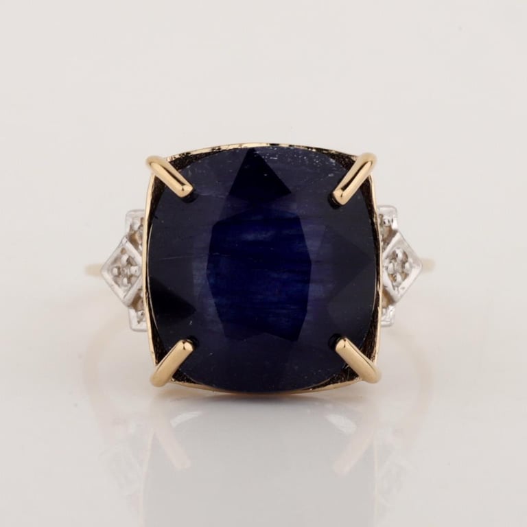 9CT YELLOW GOLD NATURAL BLUE SAPPHIRE & DIAMOND RING Weight Of The Item: 3.69 G Fineness Of Metal(S): Yellow Gold 9Kt The Ring Consists Of (1) Cushion Brilliant Natural Blue Sapphire. Surrounding The Main Stones Are Round Brilliant Cut Natural Diamonds. Antique Style Identification: Natural Blue Sapphire Color: Blue Shape: Cushion Brilliant Cut No. Of Stone: 1 Dimension: 13 Mm X 13 Mm X 7.8 Mm Weight: 10.5 Carats Cut: Very Good Identification: Natural Diamond Shape: Round Brilliant Cut Weight: 0.03 Cts Cut: Excellent. Certificates Are Provided By Gemological Science International (Gsi), An Independent Third-Party Gemological Laboratory Based In The Usa And Recognised Among The Top 10 Gem Labs Globally Markings: 9ct Condition: Good - Refer Images 0 488238+81