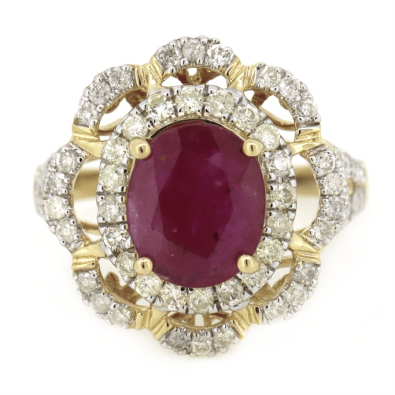 14K YELLOW GOLD, RUBY AND DIAMOND, FLORAL RING. The Centre Features, One Oval Cut, Medium Deep Pinkish-Red, Ruby (2.20Ct, Moderate Natural Inclusions, Heat Enhanced), 4 Claw Set. Decorating The Floral Halo And Split Band Are, 66 Round Brilliant Cut, Diamonds (0.816.Ct Tdw, H-I Colour, Si-I1 Clarity), Claw Set In White Gold. Ring Size Q. Valuations Provided by an Independent Third-Party Professional Not Directly Associated With Lloyds Auctions at AUD $$14,900.00This valuation has been conducted by an independent third-party professional. The valuation amount is an assessment by the issuing valuer and does not reflect the auction value of the item. Any inquiries regarding the valuation should be directed to the issuing valuer (refer to contact details on the certificate), as Lloyds Auctions has no affiliation or influence over the valuation, the valuer, or the stated amount. Condition: Good - Refer Images 0586122+83