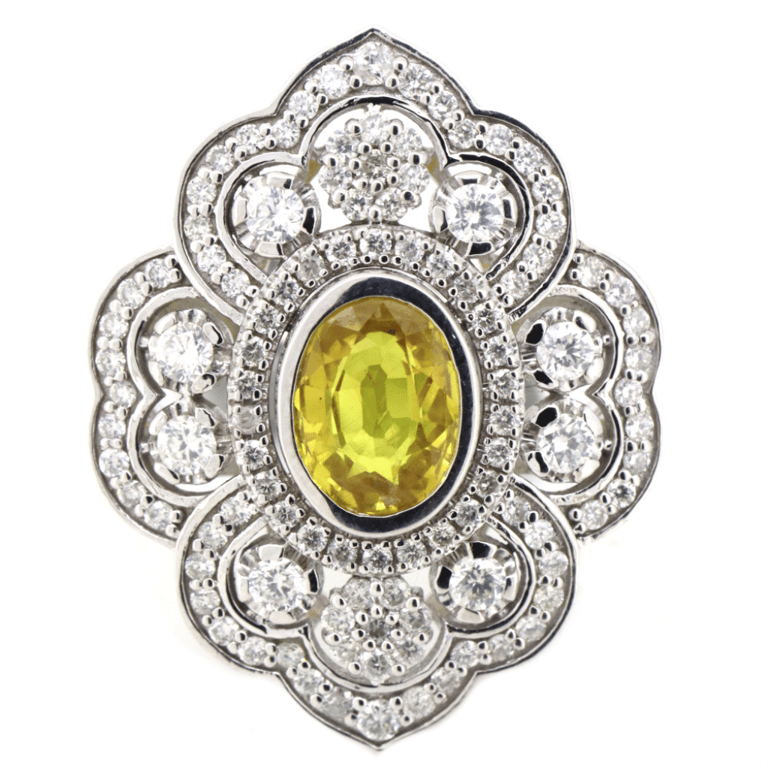 14K WHITE GOLD, YELLOW SAPPHIRE AND DIAMOND, ANTIQUE INSPIRED RING. The Centre Features, One Oval Faceted Cut, Yellow Sapphire (1.50Ct, Light Natural Inclusions), Bezel Set. Encompassing The Centre Are, 106 Round Brilliant Cut, Diamonds (0.845Ct Tdw, H-I Colour, Si-I1 Clarity), Bead/Claw Set. Ring Size N. Valuations Provided by an Independent Third-Party Professional Not Directly Associated With Lloyds Auctions at AUD $$16,700.00This valuation has been conducted by an independent third-party professional. The valuation amount is an assessment by the issuing valuer and does not reflect the auction value of the item. Any inquiries regarding the valuation should be directed to the issuing valuer (refer to contact details on the certificate), as Lloyds Auctions has no affiliation or influence over the valuation, the valuer, or the stated amount. Condition: Good - Refer Images 0586122+62