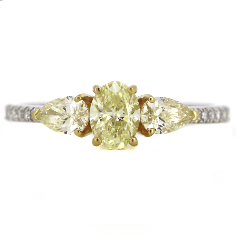 14K WHITE/YELLOW GOLD, FANCY YELLOW DIAMOND AND DIAMOND, TRILOGY RING. The Centre Features, One Oval Faceted Cut, Light Fancy Yellow, Diamond (0.46Ct, Si1-Si2 Clarity), 4 Claw Set. Flanking The Centre Are, 2 Pear Brilliant Cut, Light Fancy Yellow, Diamonds (0.40Ct Tdw, Si1-Si2 Clarity), 3 Claw Set In Yellow Gold. Decorating The Band Are, 12 Round Brilliant Cut, Diamonds (0.10Ct Tdw, G-H Colour, Si1-Si2 Clarity), Bead Set In White Gold. Ring Size N 1/2. Valuations Provided by an Independent Third-Party Professional Not Directly Associated With Lloyds Auctions at AUD $$12,000.00This valuation has been conducted by an independent third-party professional. The valuation amount is an assessment by the issuing valuer and does not reflect the auction value of the item. Any inquiries regarding the valuation should be directed to the issuing valuer (refer to contact details on the certificate), as Lloyds Auctions has no affiliation or influence over the valuation, the valuer, or the stated amount. Condition: Good - Refer Images 0586122+1