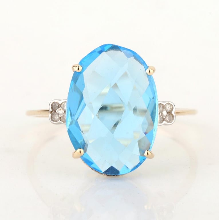 9CT YELLOW GOLD NATURAL SWISS BLUE TOPAZ & DIAMOND RING Weight Of The Item: 1.96 G Fineness Of Metal(S): Yellow Gold 9Kt The Ring Consists Of (1) Oval Brilliant Natural Swiss Blue Topaz. Surrounding The Main Stones Are Round Brilliant Cut Natural Diamonds. Identification: Natural Swiss Blue Topaz Color: Blue Shape: Oval Brilliant Cut No. Of Stone: 1 Dimension: 14 Mm X 10 Mm X 8.4 Mm Weight: 4.65 Carats Cut: Very Good Identification: Natural Diamond Shape: Round Brilliant Cut Weight: 0.07 Cts Cut: Excellent.Certificates Are Provided By Gemological Science International (Gsi), An Independent Third-Party Gemological Laboratory Based In The Usa And Recognised Among The Top 10 Gem Labs Globally Markings: 9ct Condition: Good - Refer Images 0 488218+6