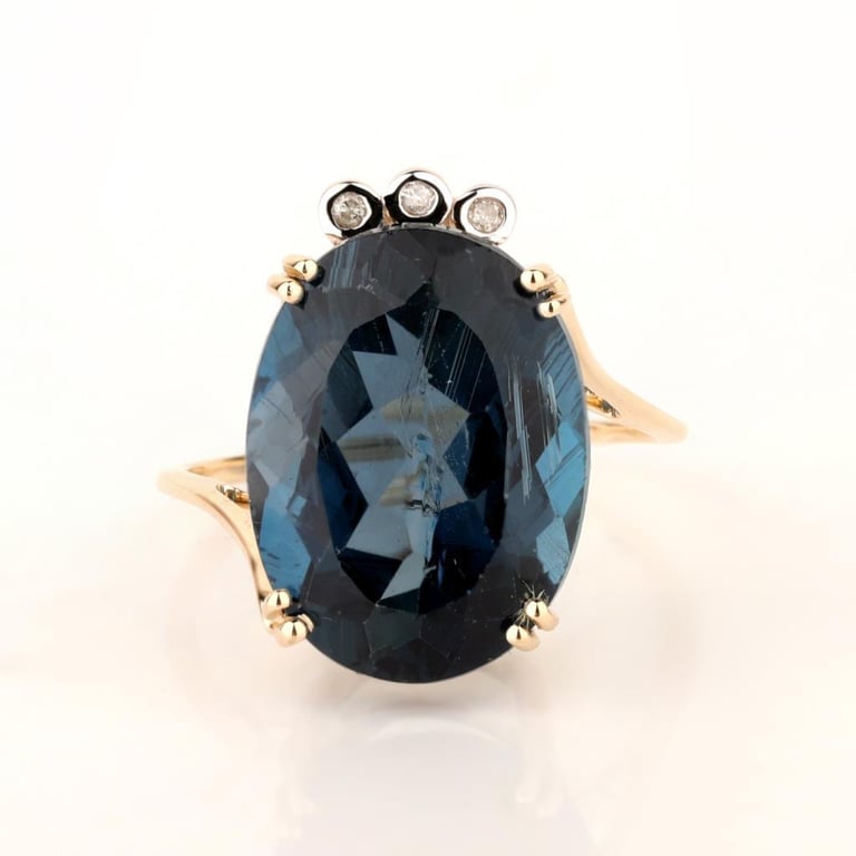 9CT YELLOW GOLD NATURAL LONDON BLUE TOPAZ & DIAMOND RING Weight Of The Item: 3.64 GFineness Of Metal(S): Yellow Gold 9KtThe Ring Consists Of (1) Oval Brilliant Natural London Blue Topaz. Surrounding The Main Stones Are Round Brilliant Cut Natural Diamonds.Identification: Natural London Blue TopazColor: BlueShape: Oval Brilliant CutNo. Of Stone: 1Dimension: 15 Mm X 11 Mm X 9 MmWeight: 11.5 CaratsCut: Very GoodIdentification: Natural DiamondShape: Round Brilliant CutWeight: 0.03 CtsCut: Excellent.Certificates Are Provided By Gemological Science International (Gsi), An Independent Third-Party Gemological Laboratory Based In The Usa And Recognised Among The Top 10 Gem Labs Globally Markings: 9ct Condition: Good - Refer Images 0488218+49