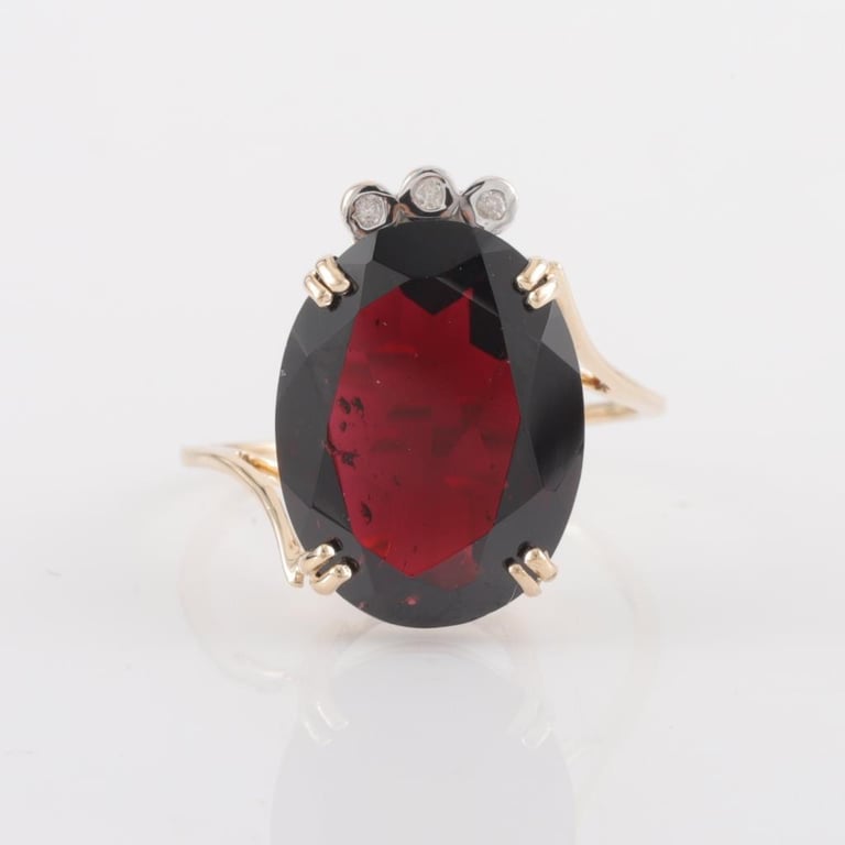 9CT YELLOW GOLD NATURAL GARNET & DIAMOND RING Weight Of The Item: 2.98 GFineness Of Metal(S): Yellow Gold 9KtThe Ring Consists Of (1) Oval Brilliant Natural Garnet. Surrounding The Main Stones Are Round Brilliant Cut Natural Diamonds.Identification: Natural GarnetColor: RedShape: Oval Brilliant CutNo. Of Stone: 1Dimension: 15 Mm X 11 Mm X 9 MmWeight: 8.8 CaratsCut: Very GoodIdentification: Natural DiamondShape: Round Brilliant CutWeight: 0.03 CtsCut: Excellent.Certificates Are Provided By Gemological Science International (Gsi), An Independent Third-Party Gemological Laboratory Based In The Usa And Recognised Among The Top 10 Gem Labs Globally Markings: 9ct Condition: Good - Refer Images 0488218+48