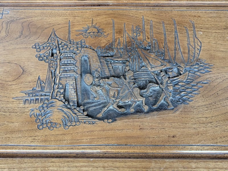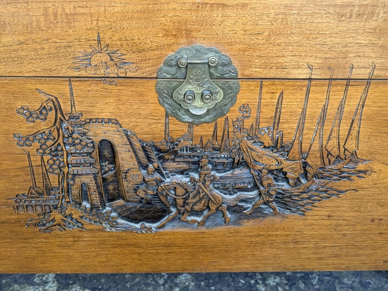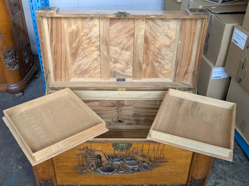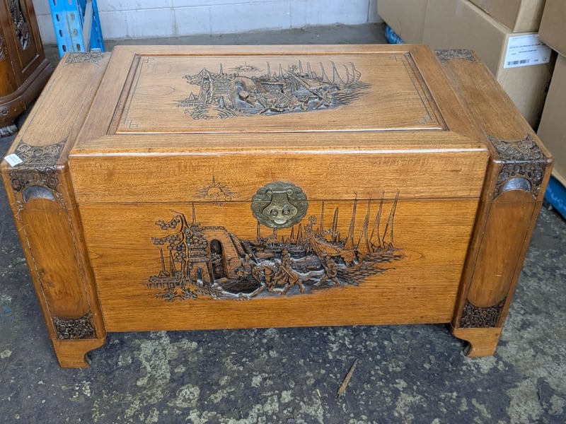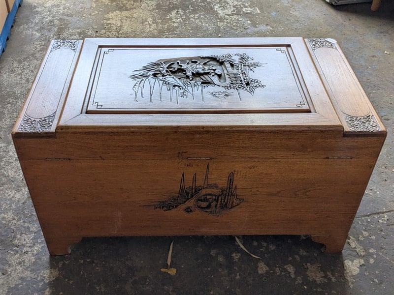 Chest, ornament style craved timber chest Dimensions 58cm H x 104cm W x 53cm D