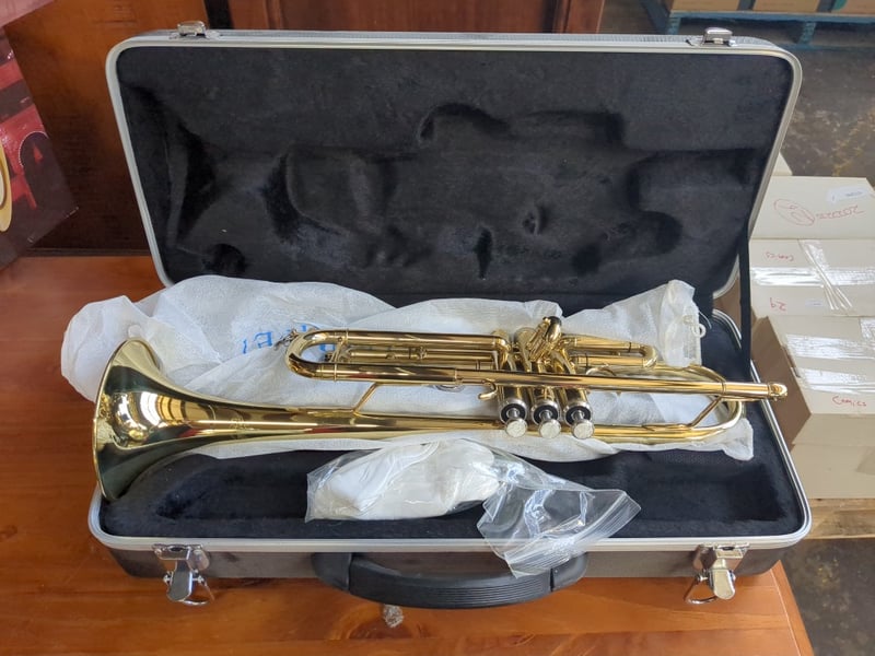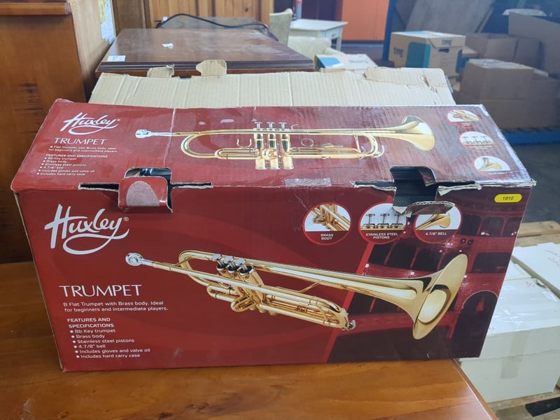 Trumpet, Huxley B flat trumpet with brass body, carry case
