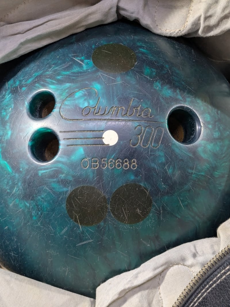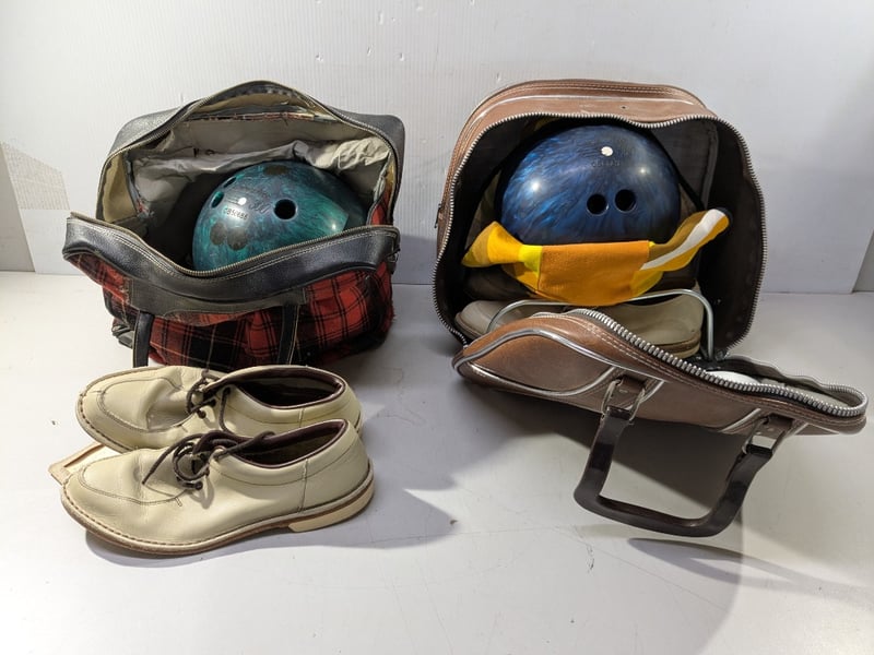 Bowling balls, x2 with carry bags and 1 x size 5 leather shoes and 1 x