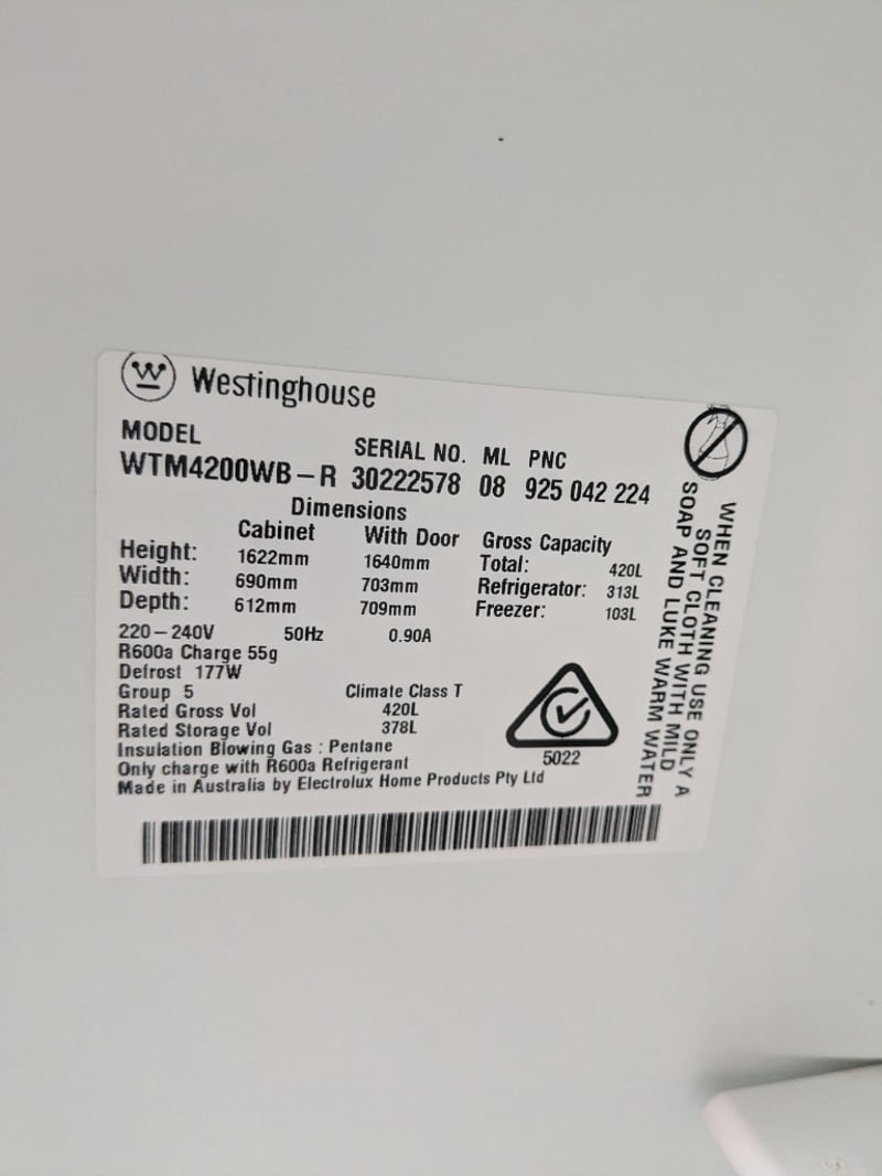 Refrigerator, Westinghouse 420L freezer/ fridge model no. WTM4200WB-R