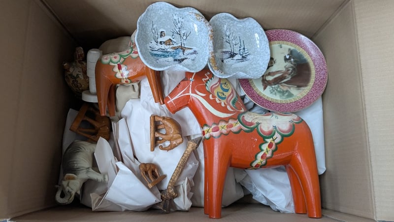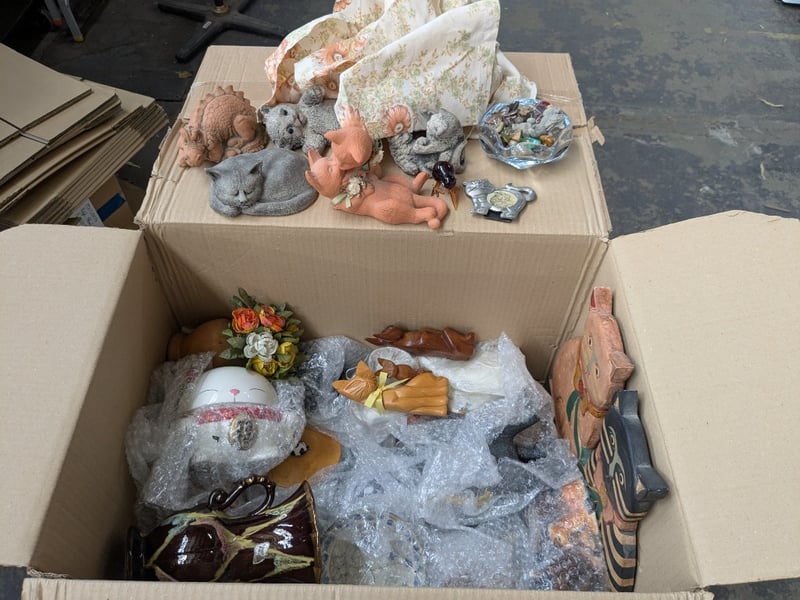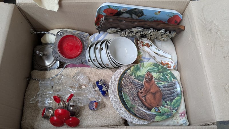 Ornaments, 3 boxes including decorative plates/ bowls, assorted animals and more Sold as lot