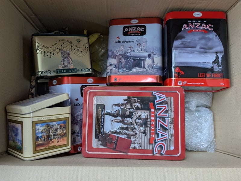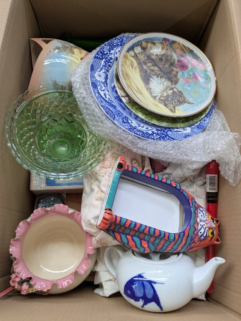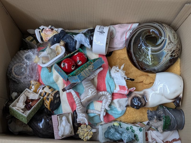 Ornaments, including small carved figurines, decorative plates, crystalware, biscuit tins and more Sold as lot
