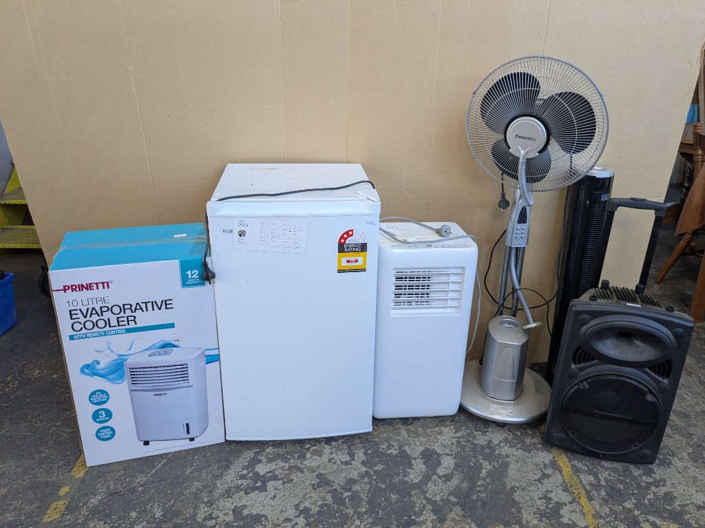 Electrical, including evaporative coolers, 84L freezer and more Sold as lot