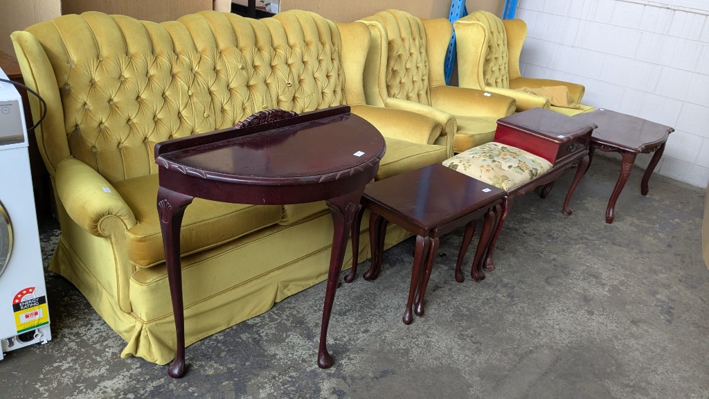 Furniture, including 3pc lounge suite, telephone chair and small tables Sold as lot