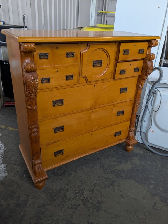 Tallboy, timber style with 7 drawers Damaged leg Dimensions 123cm H x 117cm W x 49cm D