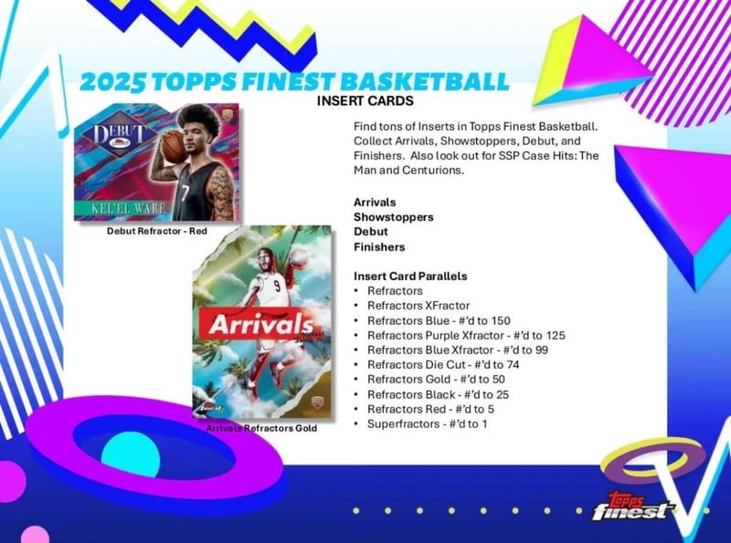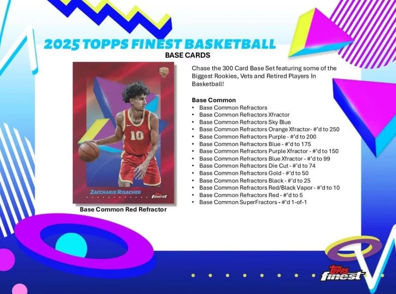 2024-25 TOPPS FINEST BASKETBALL HOBBY BOXEach Box Contains Two Autographs, Six Uncommon Base Cards, Two Rare Base Cards, Twelve Base Card Parallels, And Ten Inserts, On Average!Returning To The Hobby In 2025, Topps Finest Basketball Is Back! Find And Collect A 100 Card Base Set Featuring Some Of The Top Rookie, Vets And Retired Players In Basketball! Collect Each Level Of Featured Player In Their Base Common, Base Uncommon, And Base Rare Cards.Look For Classic As Well As Brand New Inserts: Arrivals, Showstoppers, Debut, And Finishers!As Well As A Bevy Of New Ssp Case Hits And Inserts: Centurions And The Man!Condition: Good - Refer To Images488292+33411