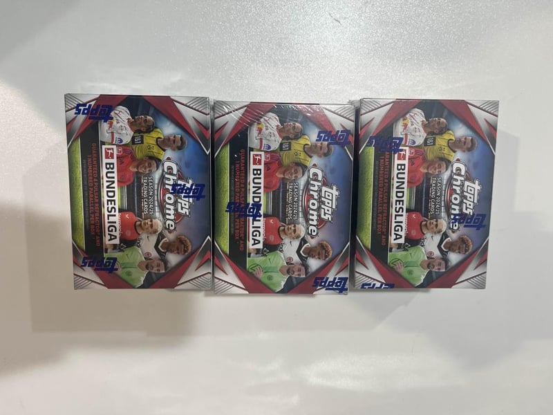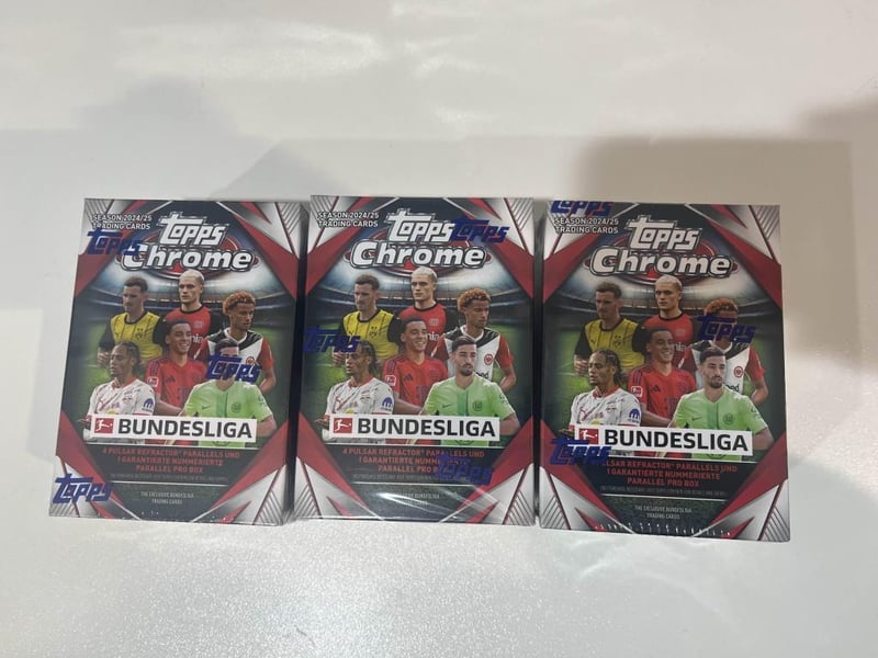 2024-25 TOPPS CHROME BUNDESLIGA SOCCER BLASTER BOX – BUNDLE OF 3Fuel Your Passion For The Game With This Bundle Of Three (3) 2024-25 Topps Chrome Bundesliga Soccer Blaster Boxes — A Must-Have For Soccer Collectors Chasing The Sharp Chrome Finish, Exciting Rookies, And Exclusive Parallels That Make Topps Chrome A Standout Every Season.Each Box Contains 6 Packs With 4 Cards Per Pack, For A Total Of 72 Cards Across This Bundle. Whether You'Re Collecting The Stars Of Today Or Investing In Tomorrow’S Breakout Talents, Bundesliga Chrome Delivers A High-Gloss Experience Packed With Chase Potential.Key Features Include:Blaster-Exclusive X-Fractor Parallels – Stunning Patterned Refractors Only Found In Blaster BoxesTop Bundesliga Rookies – Including First Topps Chrome Cards Of Emerging Talents And Future Global StarsChrome Autographs – Randomly Inserted Signature Cards From Top-Tier PlayersColor Parallels – Including Aqua, Purple, Pink, And Numbered Refractors That Add Serious Value And CollectabilityInserts Like Future Stars, Golazo, And Speckle Refractors – Adding Depth And Visual Flair To The SetCollect Stars From Bayern Munich, Borussia Dortmund, Rb Leipzig, And More, All In Topps’ Signature Chrome FinishWith Three Blasters In One Bundle, You Triple Your Chances At Pulling Rare Hits, Rookie Refractors, And Standout Parallels. Whether You'Re Chasing Value, Building Your Set, Or Ripping For Fun, The 2024-25 Topps Chrome Bundesliga Blaster Box Bundle Is A Premium Experience For Any Soccer Fan Or Collector.Perfect For Fans Of European Football, Rookie Hunters, Or Those Looking To Add Sparkle To Their Collection — Topps Chrome Bundesliga Brings The Action Straight From The Pitch To Your Hands.Condition: Good - Refer To Images488292+33452