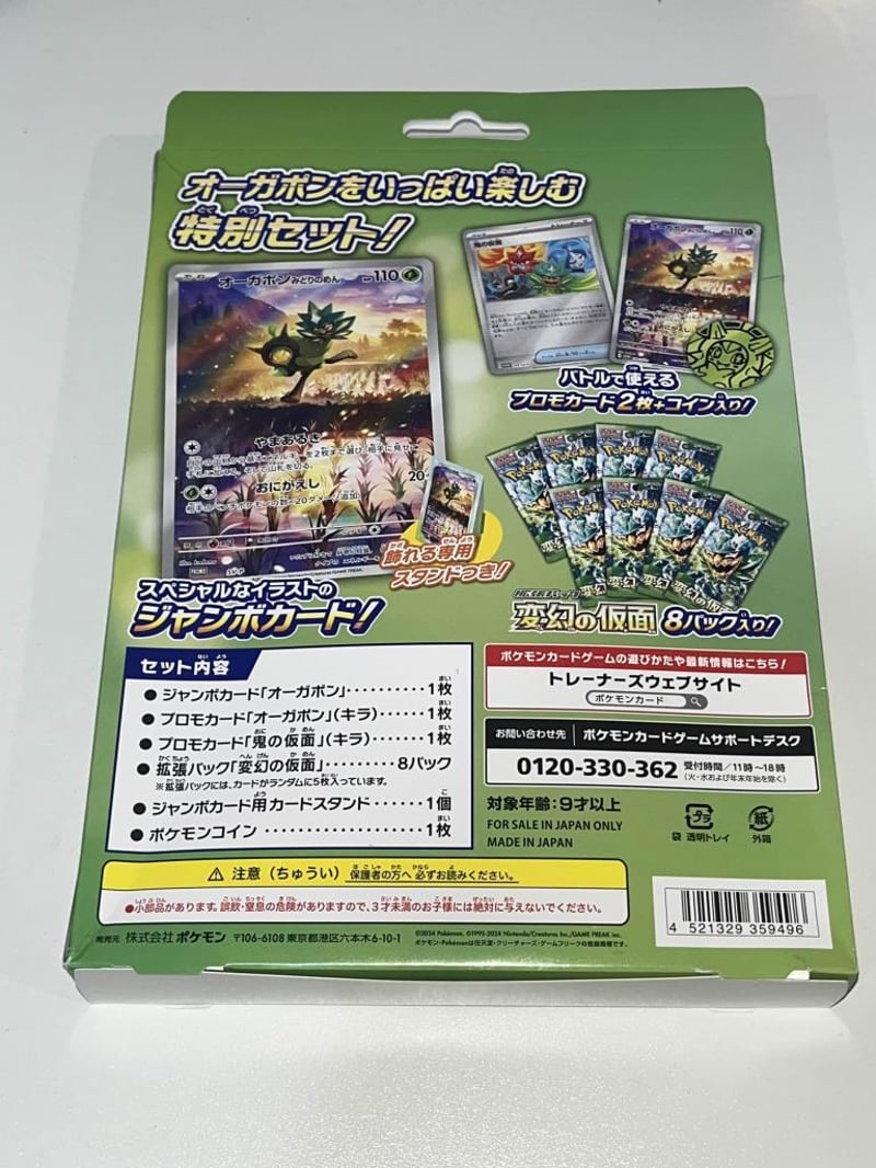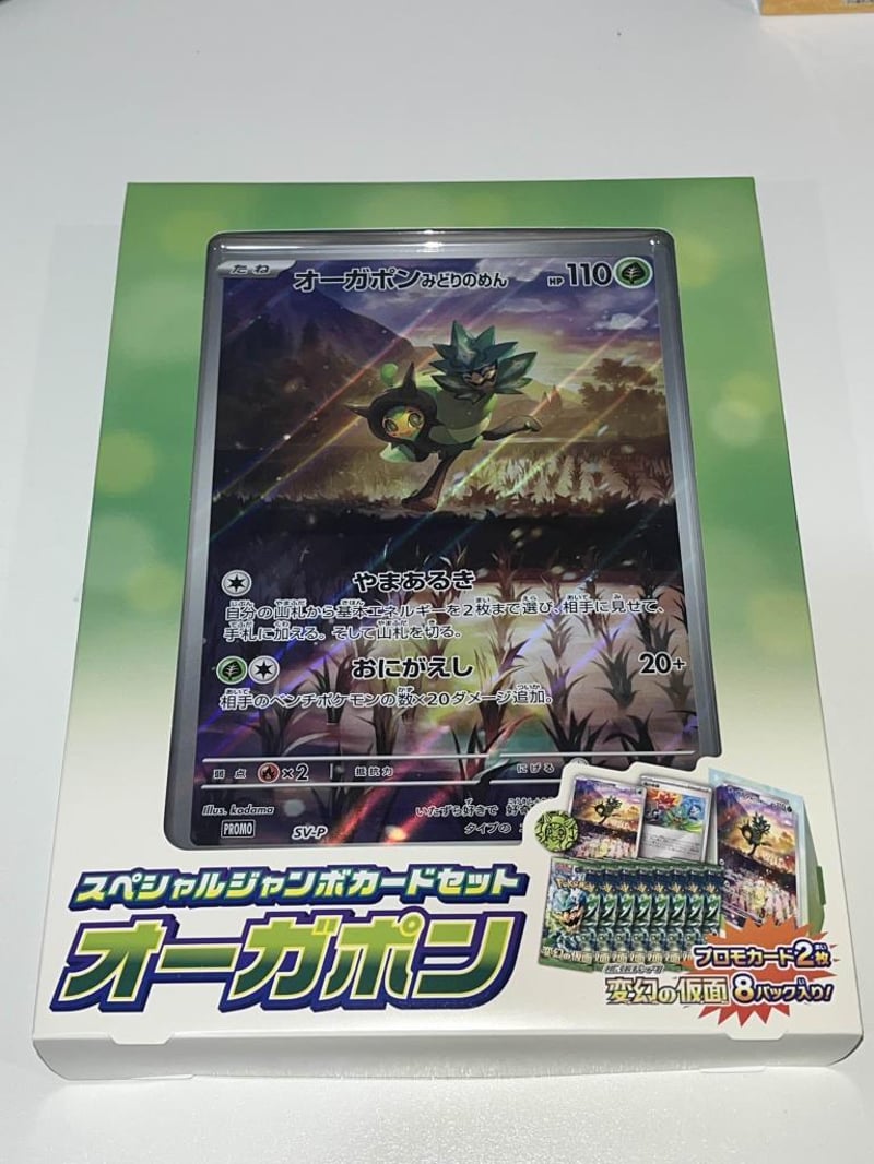 POKEMON TCG SPECIAL JUMBO CARD SET Japanese Pokémon Tcg Special Jumbo Card Set Featuring Ogerpon. This Exclusive Set Was Released In Japan And Includes Promotional Content Themed Around The Mask Of Change Expansion. The Set Contains A Large-Format Jumbo Promo Card Of Ogerpon, Along With Two Standard-Size Promo Cards. It Also Includes 8 Booster Packs From The Japanese “Mask Of Change” Set, Making It A Great Addition For Collectors Or Competitive Players Looking For New Cards. All Contents Are In Japanese. The Box Is In Excellent Condition With Original Factory Seal Intact. This Is An Official Product Made By The Pokémon Company. A Must-Have For Pokémon Collectors And Fans Of The Paldea Region. Ships With Care To Preserve Box Condition. Condition: Good - Refer To Images 488292+33453