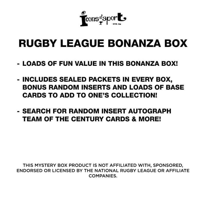 RUGBY LEAGUE BONANZA BOXRugby League Bonanza Box• Loads Of Fun Value In This Bonanza Box!• Includes Sealed Packets In Every Box, Bonus Random Inserts And Loads Of Base Cards To Add To One'S Collection!• Search For Random Insert Autograph, Team Of The Century Cards & More!This Mystery Box Product Is Not Affiliated With, Sponsored, Endorsed Or Licensed By The National Rugby League Or Affiliate Companies.Condition: Good - Refer To Images488292+33463