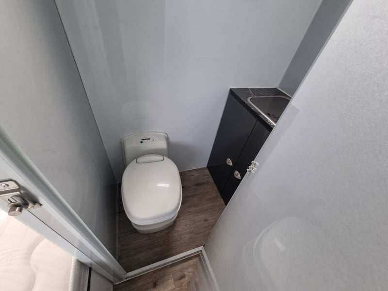 shower head and soap carrier with Thetford brand toilet and convenient portable toilet tank door, with RV roof air vent with air vent cover