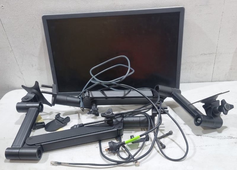 Office Essentials - Monitors, brackets, HDMI cords,power cords Note: All lots are allocated in bulk. Photos serve as a reference only and the contents of each box may vary. Some boxes may not include Monitor stands, Monitor Models may Vary.